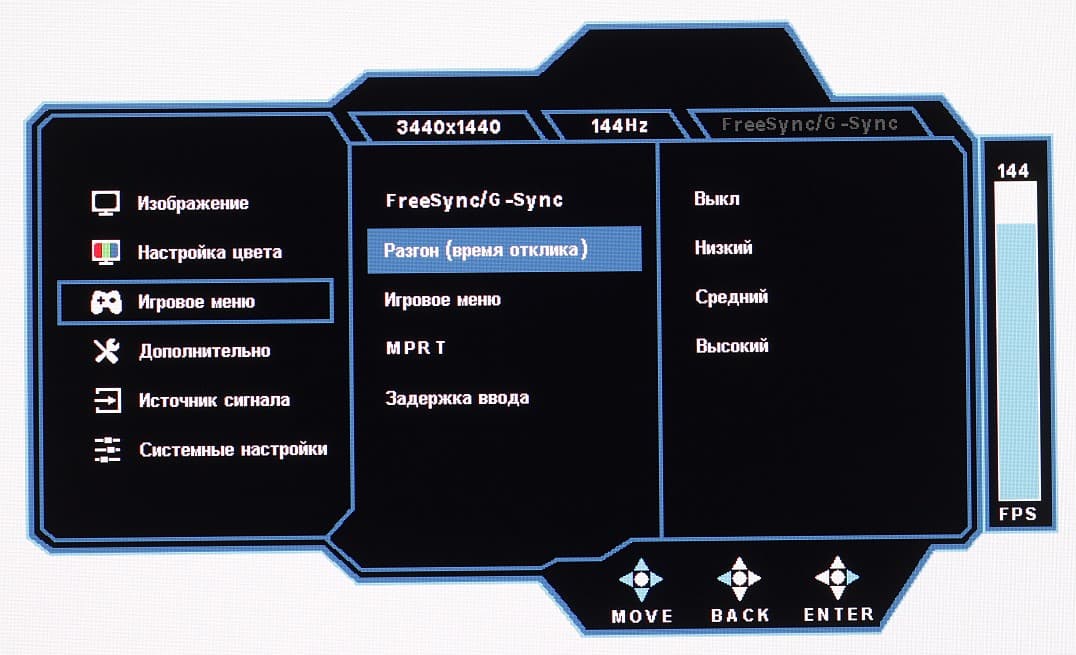 Мы определяли полную задержку вывода от переключения страниц видеобуфера до начала вывода изображения на экран (напомним, что она зависит от особенностей работы ОС Windows и видеокарты, а не только от монитора). Задержка вывода изображения (FreeSync отключено) при 144 Гц равна 7 мс. Это очень небольшая задержка, она абсолютно не ощущается при работе за ПК, да и в играх не приведет к снижению результативности.