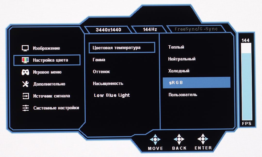 Настроек, влияющих на яркостный и цветовой баланс, не очень много, что для игрового монитора ожидаемо. Есть регулировки яркости (подсветки) и контрастности, уровня черного и контурной резкости, оттенка и насыщенности. Присутствуют выбор профиля гамма-кривой и функции принудительного снижения интенсивности синей компоненты и динамической регулировки яркости подсветки. Можно корректировать цветовой баланс выбором цветового профиля из четырех предустановленных или пользовательского, в котором цветовой баланс можно подправить регулировками интенсивности трех основных цветов.