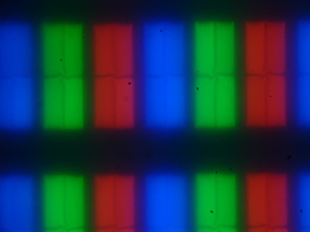 Четкое изображение структуры пикселей из-за матовой поверхности получить не удается, впрочем, на фрагменте ниже можно разглядеть типичную для VA структуру в виде параллельных полосок, а также что каждый субпиксель делится на четыре равных домена, в которых полоски ориентированы под разными углами (черные точки — это пыль на матрице фотоаппарата):