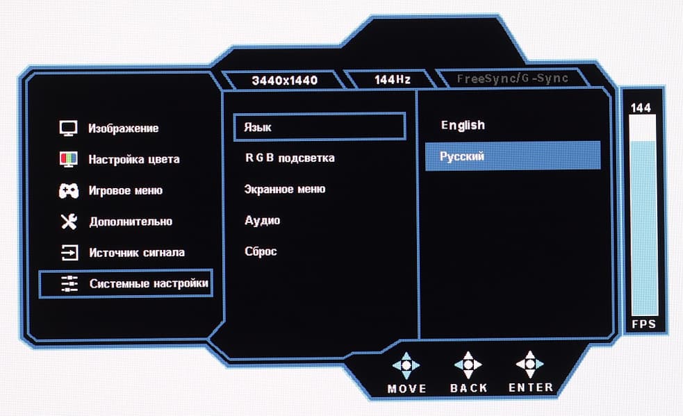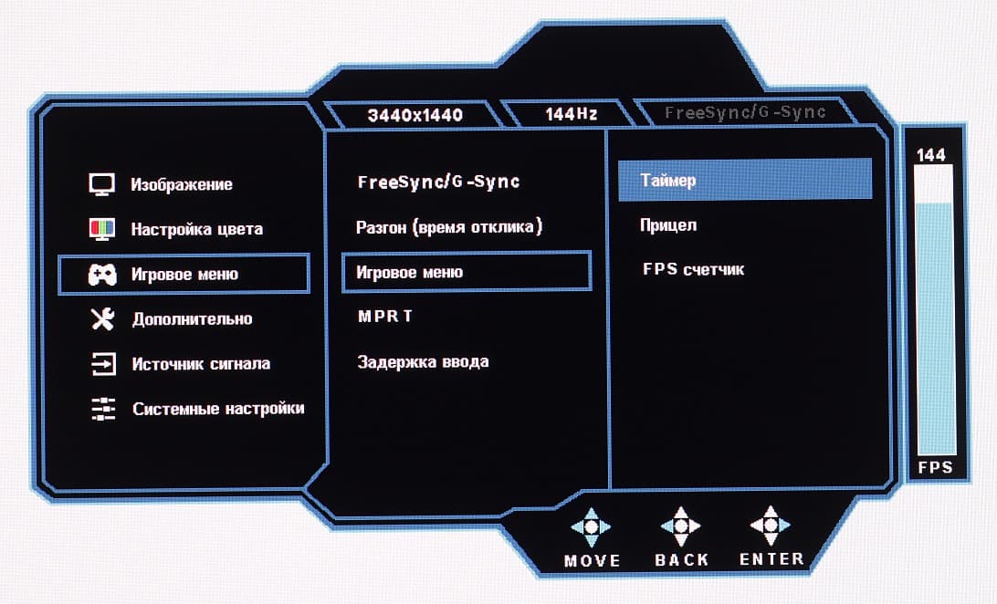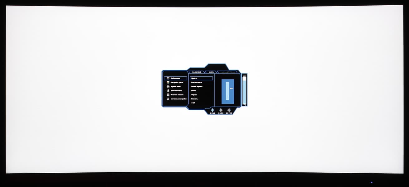 Индикатор питания неярко светится синим при работе, мигает красным — в режиме ожидания, и не горит, если монитор условно выключен. Если монитор работает, и на экране нет меню, то при отклонении джойстика вверх выводится меню выбор входа, вниз — меню выбора входного порта концентратора USB (функция KVM), влево — меню игровых функций, а именно таймера, экранного прицела и счетчика частоты кадров. Короткое нажатие на джойстик выводит на экран основное меню с настройками, при этом длительное нажатие на джойстик выключает монитор. Меню достаточно крупное, надписи читаемые (белое поле — вся область отображения):