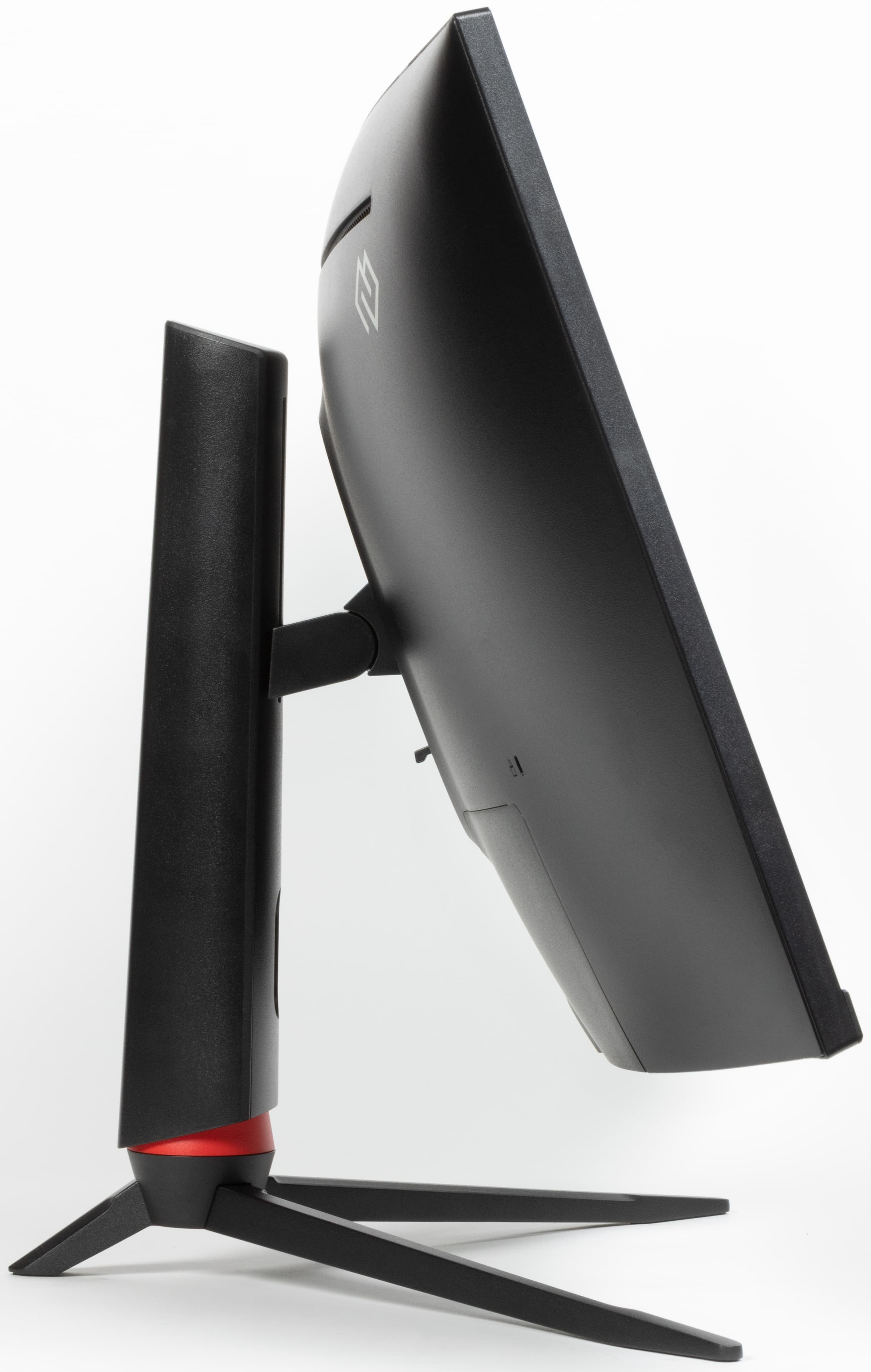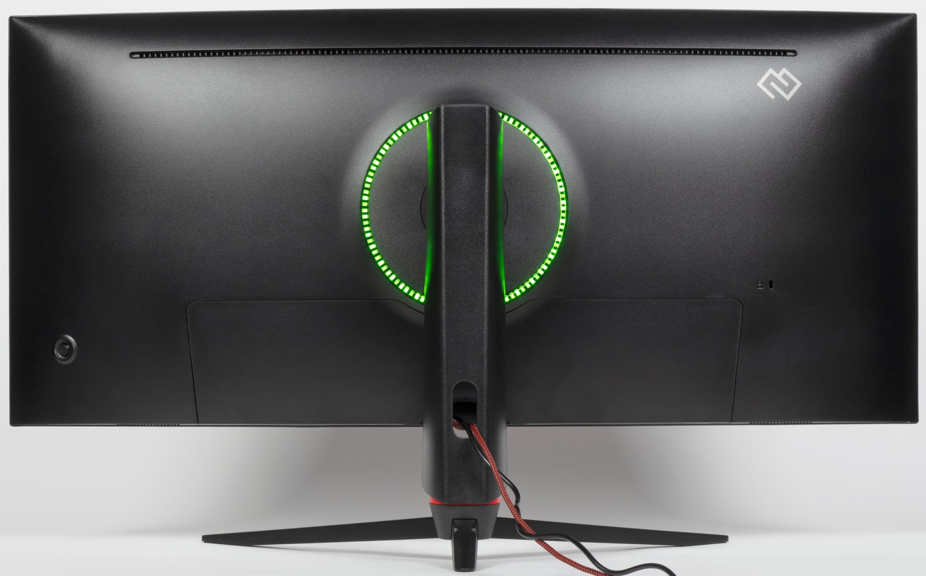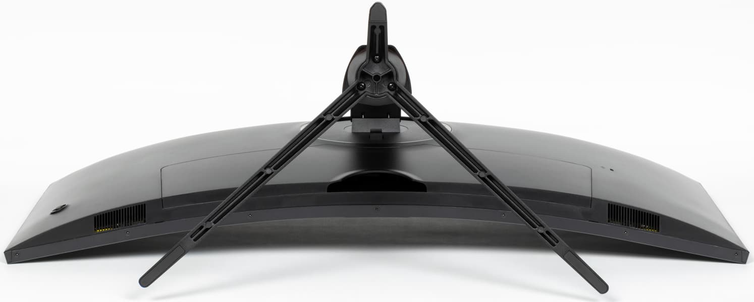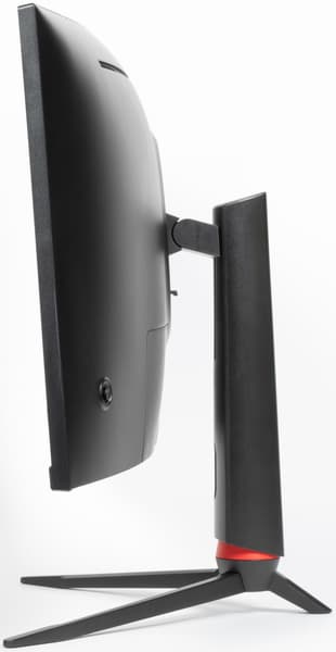 Дизайн умеренно игровой. Внешние элементы блока экрана, кожухи стойки и узла крепления блока экрана изготовлены из черного пластика с матовой поверхностью. Ориентацию на игроков выдают трехпалое основание подставки, изготовленное из алюминиевого сплава и имеющее стойкое матовое черное покрытие, красное кольцо в нижней части стойки, а также подсветка на задней панели. Внешняя поверхность матрицы черная, полуматовая (зеркальность хорошо выражена), внешний слой матрицы жесткий. Плоскость экрана изогнута по цилиндру с заявленным с радиусом кривизны 1500 мм так, что правый и левый край немного выдвинуты вперед. Спереди экран выглядит как монолитная поверхность, ограниченная снизу неширокой планкой, а по периметру — узкой окантовкой. Выведя изображение на экран, можно увидеть, что на самом деле между внешними границами экрана и собственно областью отображения есть неширокие поля.