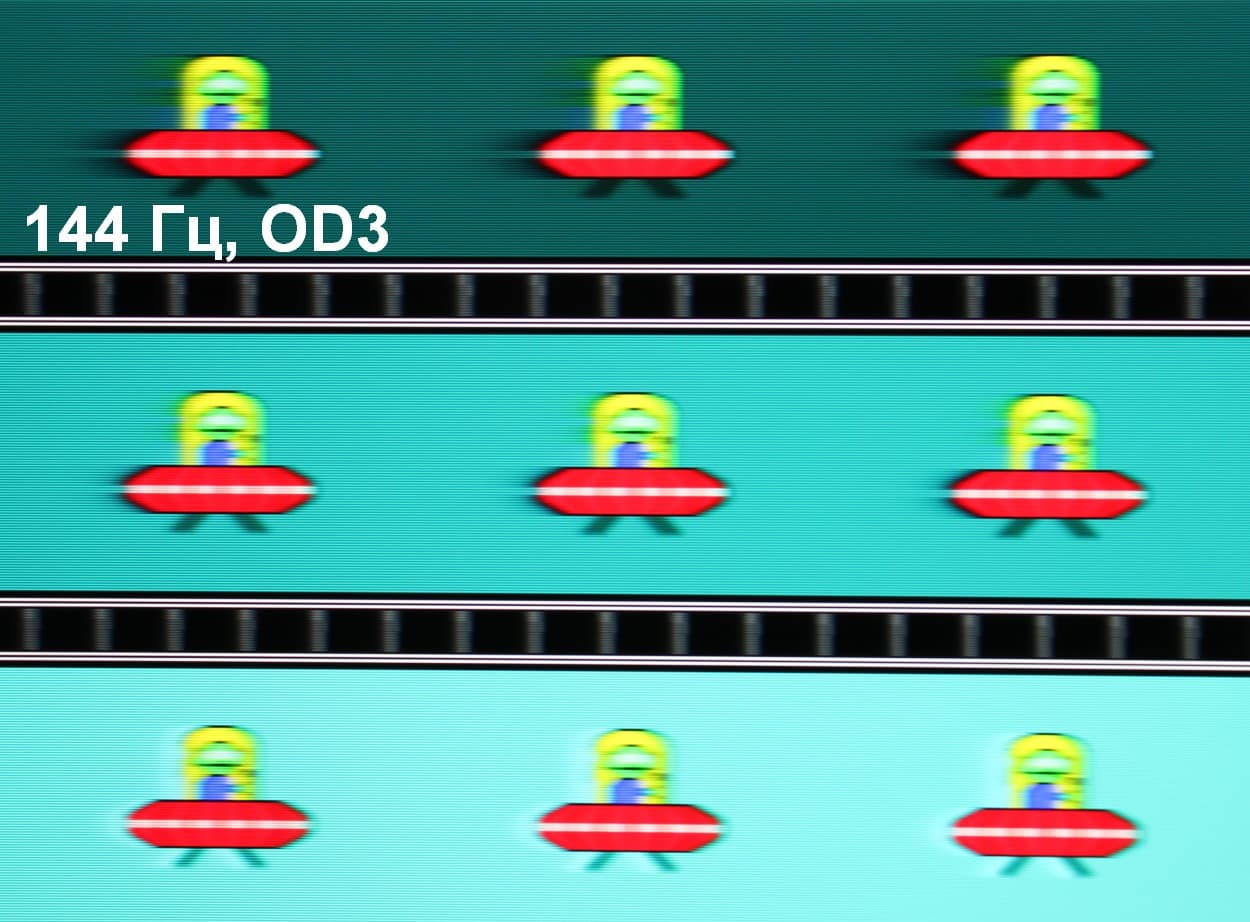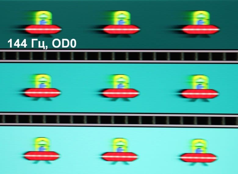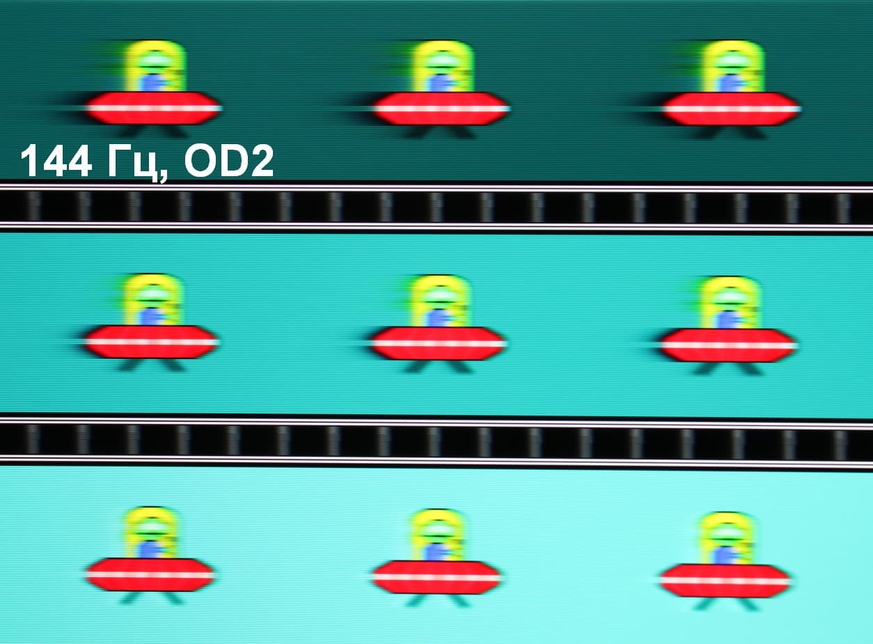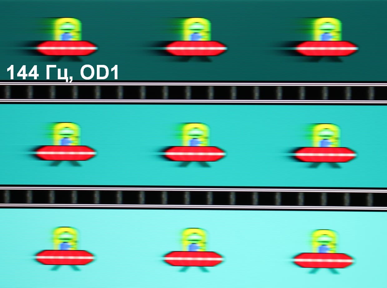 Для наглядного представления о том, что на практике означает такая скорость матрицы, какие могут быть артефакты от разгона и повышает ли четкость в движении, описанная выше настройка MPRT приведем серию снимков, полученных с помощью движущейся камеры. Такие снимки показывают, что видит человек, если он следит глазами за двигающимся на экране объектом. Описание теста приведено тут, страница с самим тестом тут. Использовались рекомендованные установки (скорость движения 960 и 1008 пиксель/с для частот обновления 60 (и 120) и 144 Гц, соответственно), выдержка 1/15 с, на фотографиях указаны значения частоты обновления, а также ступени разгона (OD) и настройки MPRT.