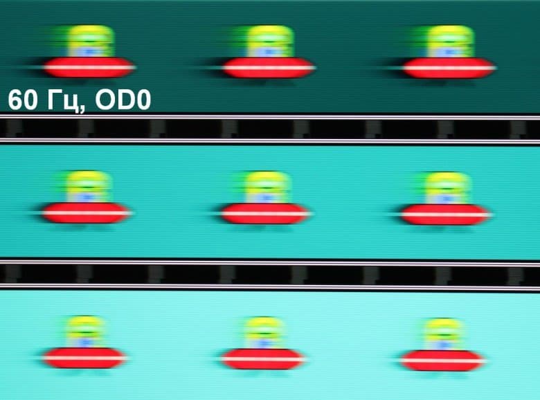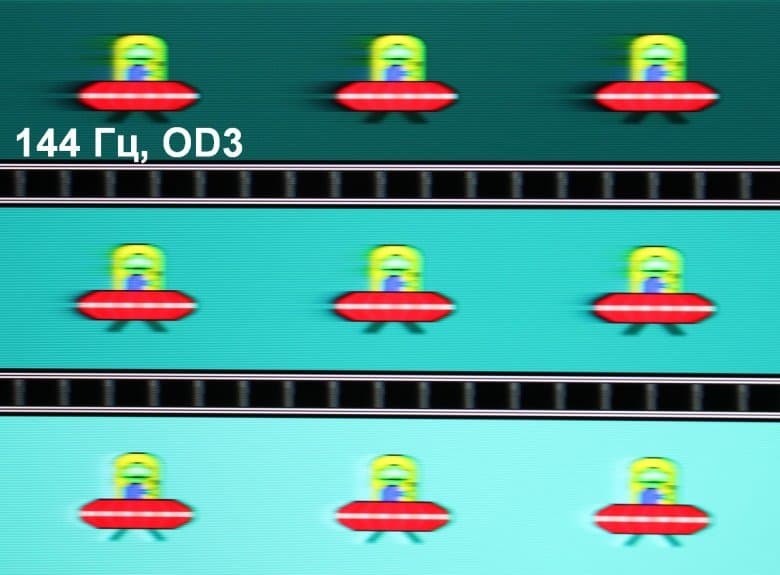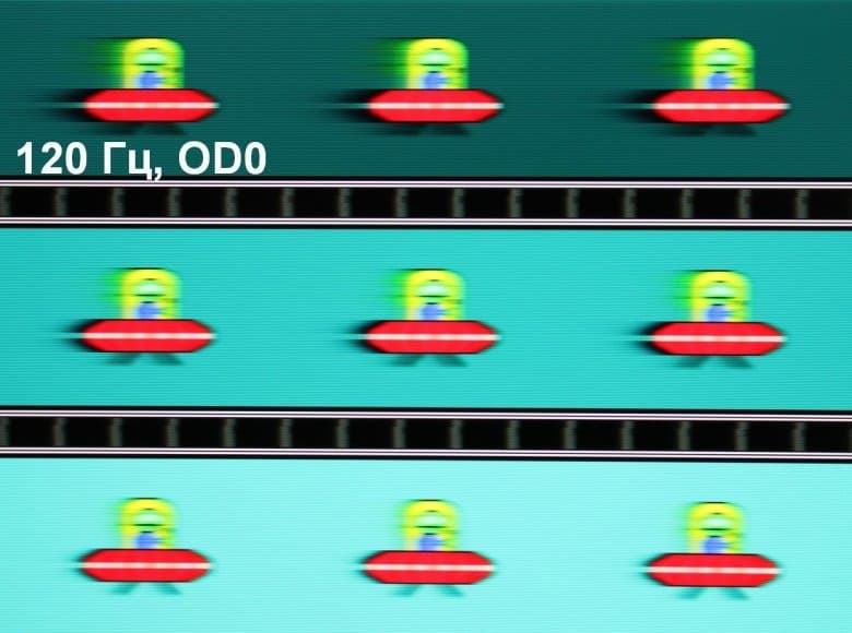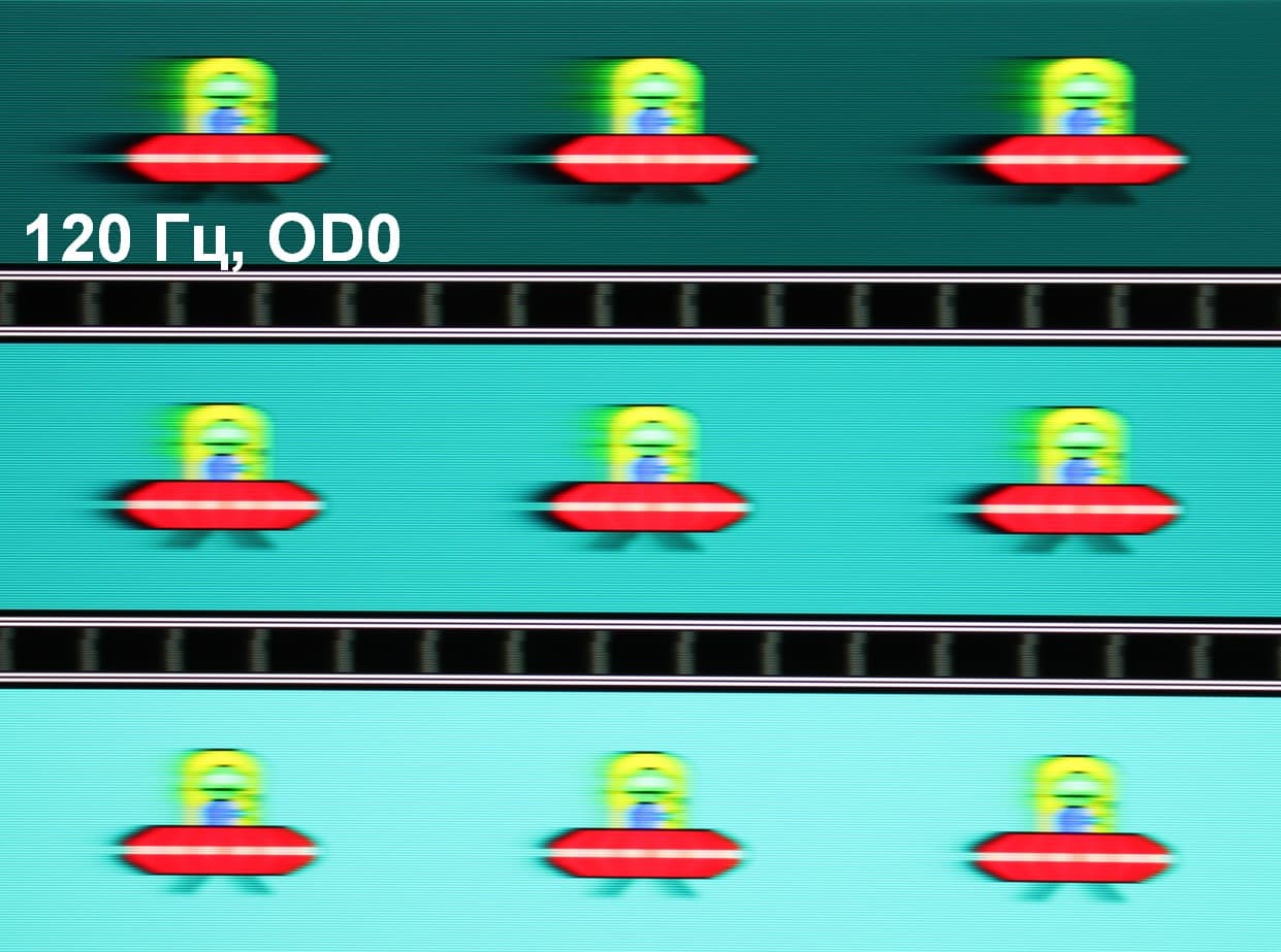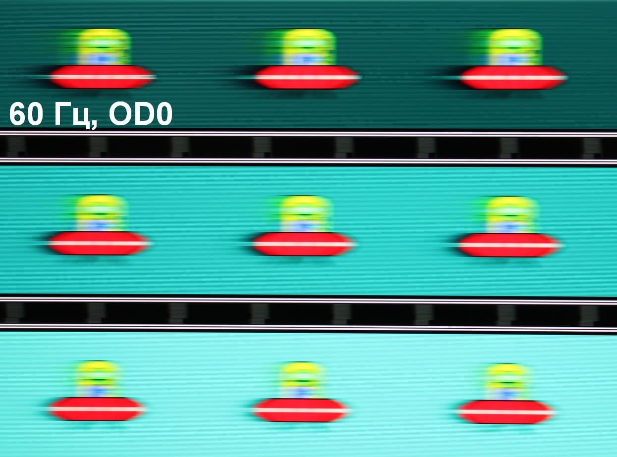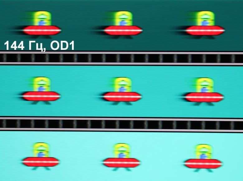 Для наглядного представления о том, что на практике означает такая скорость матрицы, какие могут быть артефакты от разгона и повышает ли четкость в движении, описанная выше настройка MPRT приведем серию снимков, полученных с помощью движущейся камеры. Такие снимки показывают, что видит человек, если он следит глазами за двигающимся на экране объектом. Описание теста приведено тут, страница с самим тестом тут. Использовались рекомендованные установки (скорость движения 960 и 1008 пиксель/с для частот обновления 60 (и 120) и 144 Гц, соответственно), выдержка 1/15 с, на фотографиях указаны значения частоты обновления, а также ступени разгона (OD) и настройки MPRT.