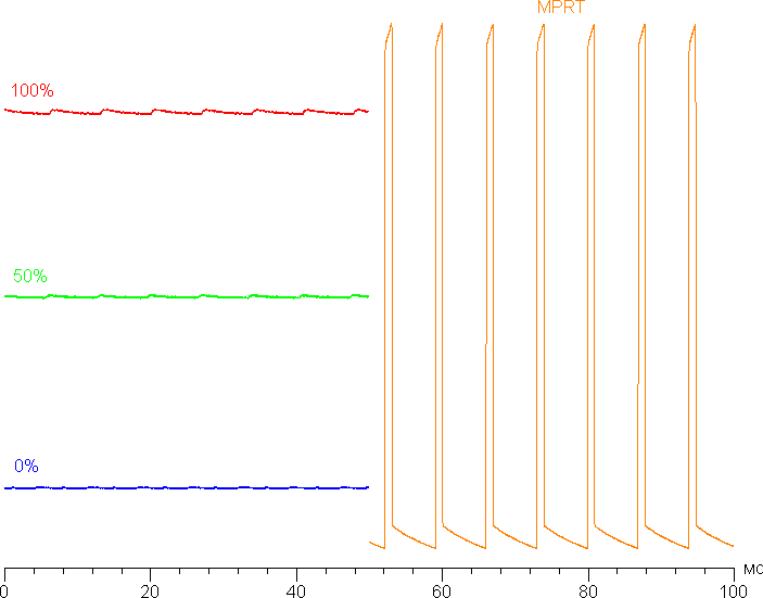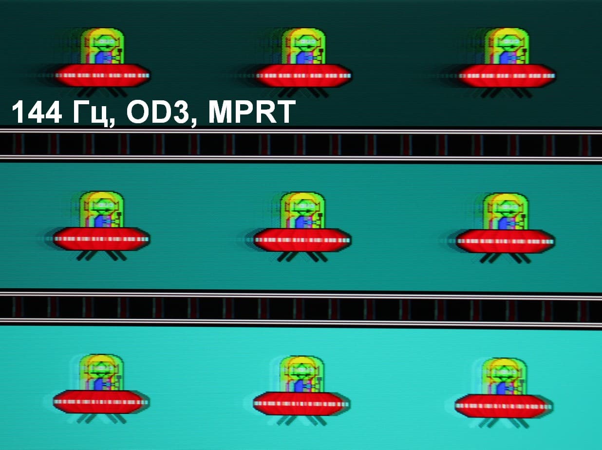 Есть режим со вставкой темного кадра (черным он в данном случае не является) с названием MPRT. Зависимости яркости (вертикальная ось) от времени (горизонтальная ось) когда эта функция включена приведена на правой половине рисунка выше. Четкость в движении действительно повышается (и производитель может указывать невероятные 1 мс с оговоркой, что это характеристика MPRT), но на динамичной картинке появляются артефакты, о чем будет рассказано ниже, а из-за мерцания с частотой максимум в 144 Гц данный режим рекомендуется использовать с осторожностью, так как мерцание может приводить к повышенной утомляемости глаз. К тому же при включении этого режима сильно снижается яркость (до 102 кд/м²), что также снижает его ценность.