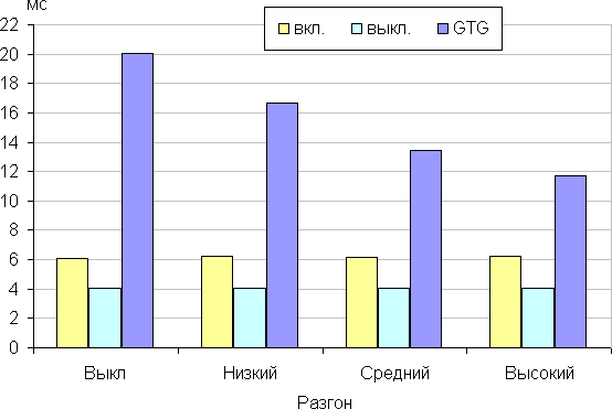 График ниже показывает, как меняется время включения и выключения при переходе черный-белый-черный (столбики «вкл.» и «выкл.»), а также среднее суммарное время для переходов между полутонами (столбики «GTG») для двух значений этой настройки: