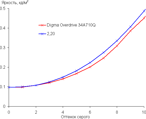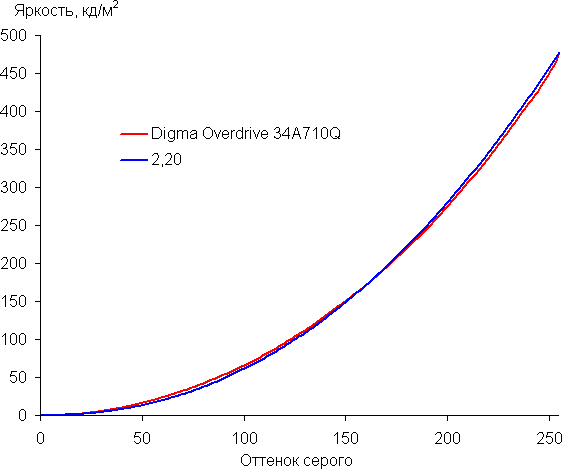 Аппроксимация полученной гамма-кривой дала показатель 2,20, что равно стандартному значению 2,2. При этом аппроксимирующая степенная функция немного отклоняется от реальной гамма-кривой: