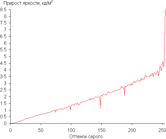 Реальная гамма-кривая ближе всего к стандартной при выборе варианта Гамма = 2.2, поэтому далее мы измерили яркость 256 оттенков серого (от 0, 0, 0 до 255, 255, 255) при этом значении. График ниже показывает прирост (не абсолютное значение!) яркости между соседними полутонами: