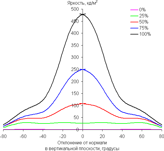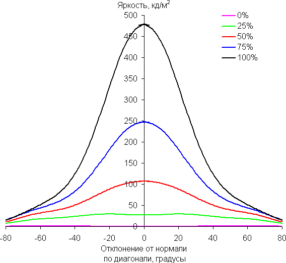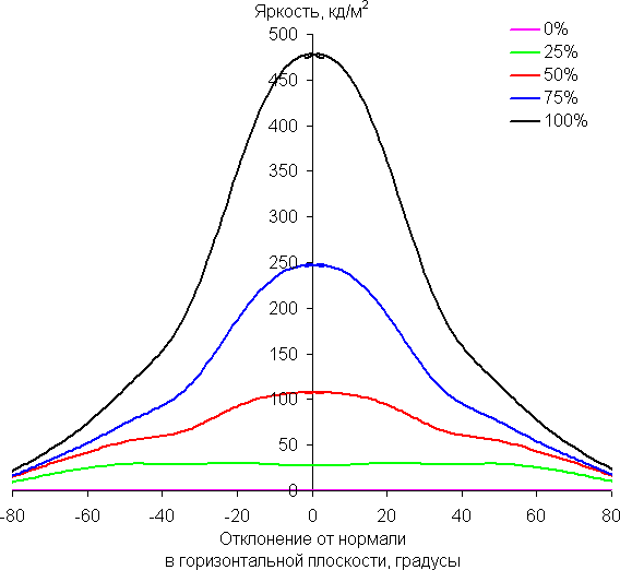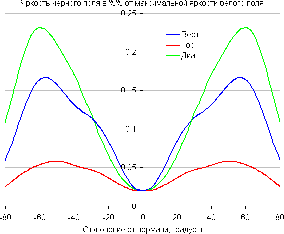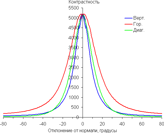 По скорости падения яркости углы обзора неширокие. Отметим примерно одинаковый характер уменьшения яркости при отклонении от перпендикуляра к экрану во всех трех направлениях, при этом графики не пересекаются в значимом диапазоне измеряемых углов. При отклонении в диагональном направлении яркость черного поля достигает большего значения, чем в двух других случаях. Однако максимум яркости черного поля все равно гораздо меньше, чем в случае типичного монитора на матрице IPS. Контрастность в диапазоне углов ±82° остается существенно выше значения 10:1.