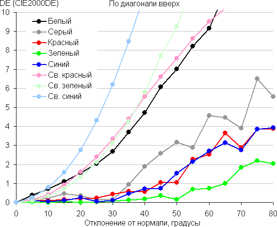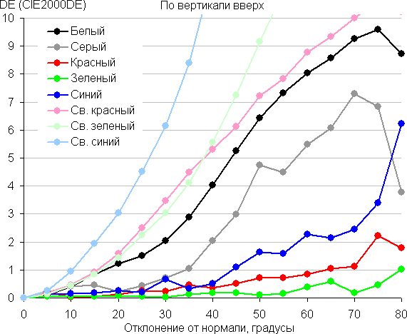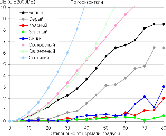 Для количественной характеристики изменения цветопередачи мы провели колориметрические измерения для белого, серого (127, 127, 127), красного, зеленого и синего, а также светло-красного, светло-зеленого и светло-синего полей во весь экран с использованием установки, подобной той, что применялась в предыдущем тесте. Измерения проводились в диапазоне углов от 0° (датчик направлен перпендикулярно к экрану) до 80° с шагом в 5°. Полученные значения интенсивностей были пересчитаны в ΔE относительно замера каждого поля при перпендикулярном положении датчика относительно экрана. Результаты представлены ниже: