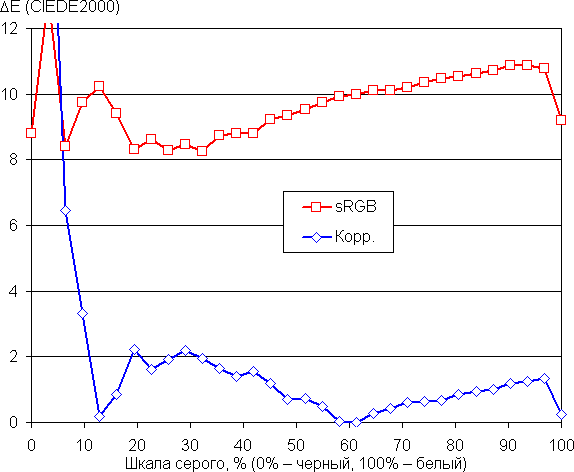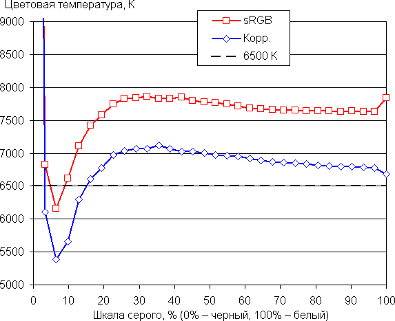Цветовой баланс в самом ярком режиме (то есть без коррекции) отличается от стандартного, так как цветовая температура на различных участках шкалы серого выше 6500 К, а отклонение от спектра абсолютно черного тела (параметр ΔE) местами выше 10 единиц. Мы попытались его улучшить, регулируя усиление трех основных цветов. Удалось приблизить цветовую температуру к стандартным 6500 К и снизить ΔE, сохранив невысокую вариацию этих параметров на шкале серого, что улучшает визуальное восприятие цветового баланса. Графики ниже показывают цветовую температуру на различных участках шкалы серого и ΔE в случае отсутствия вмешательства и после ручной коррекции (R = 50, G = 46, B = 46):