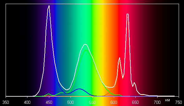 Ниже приведен спектр для белого поля (белая линия), наложенный на спектры красного, зеленого и синего полей (линии соответствующих цветов):