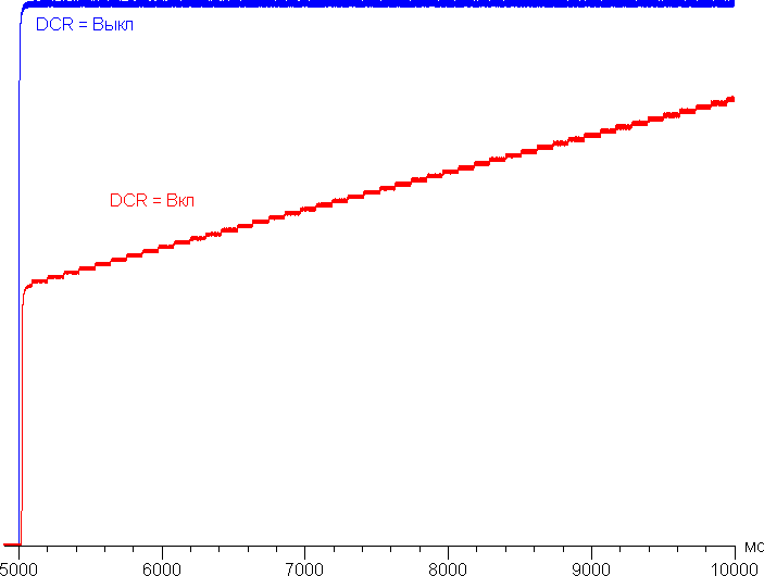 При включении режима DCR с динамическим управлением яркости установившаяся контрастность формально возрастает до бесконечности, так как на черном поле во весь экран подсветка выключается совсем через 11 секунд. Впрочем, уже курсора мыши достаточно для включения подсветки. График ниже показывает, как увеличивается яркость (вертикальная ось) при переключении с черного поля (после пяти секунд вывода) на белое при выключенной и включенной динамической подстройке яркости: