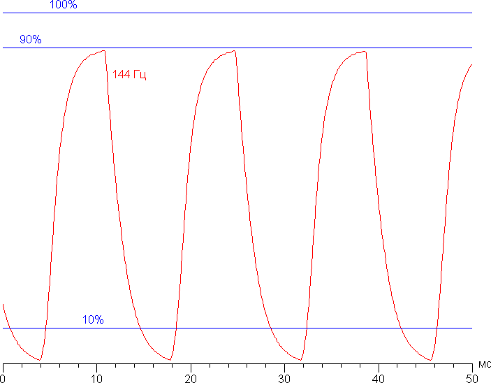 Видно, что максимальная яркость белого кадра лишь немного ниже уровня 90% от белого, а минимальная яркость черного кадра приближается к уровню черного. Амплитуда изменения яркости выше 80% от уровня белого, то есть согласно этому формальному критерию скорости матрицы достаточно для вывода изображения с кадровой частотой 144 Гц.
