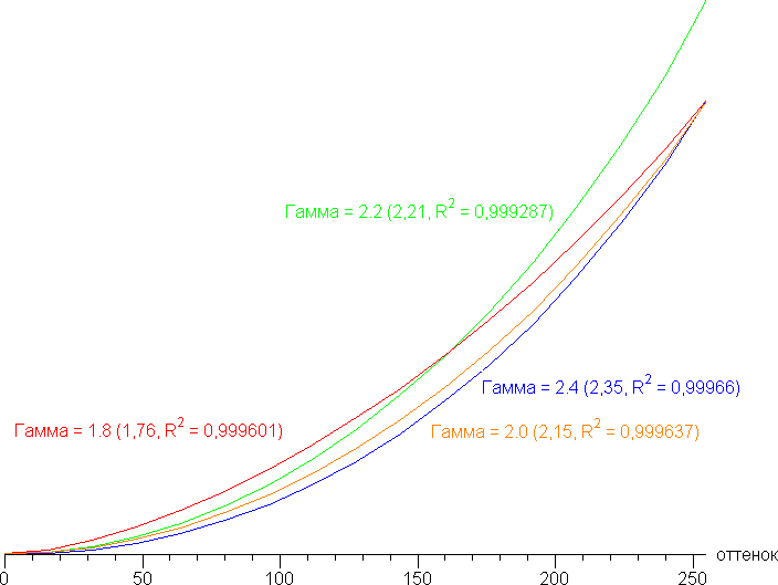 Реальная гамма-кривая зависит от выбранного профиля в списке Гамма (значения показателей аппроксимирующей функции приведены в скобках в подписях, там же — коэффициент детерминации):