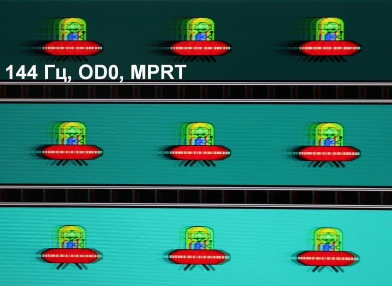 Видно, что при прочих равных условиях четкость изображения повышается по мере роста частоты обновления и степени разгона. Включение MPRT увеличивает четкость, но объекты в движении получают хвосты в виде бледных дубликатов, что снижает положительный эффект. Видимо, оптимальным вариантом является максимальный разгон без включения MPRT.
