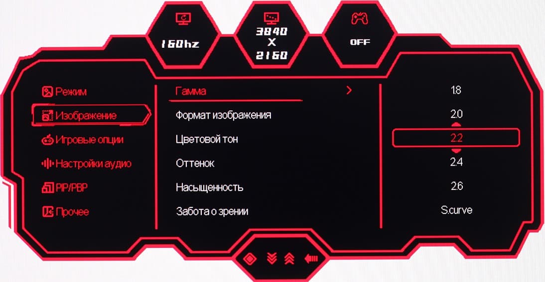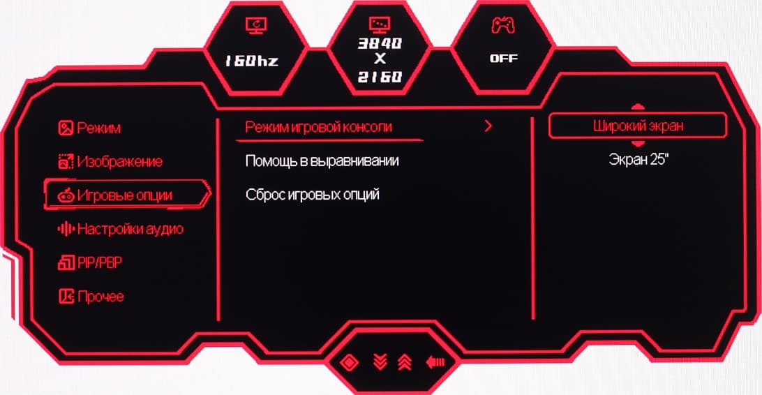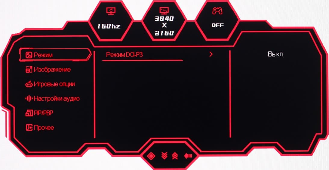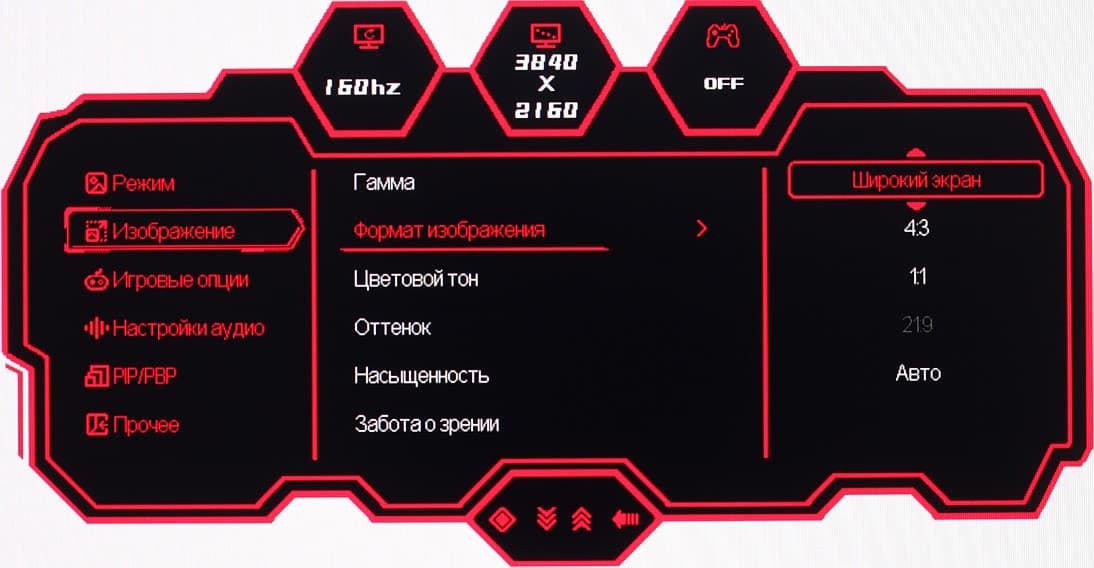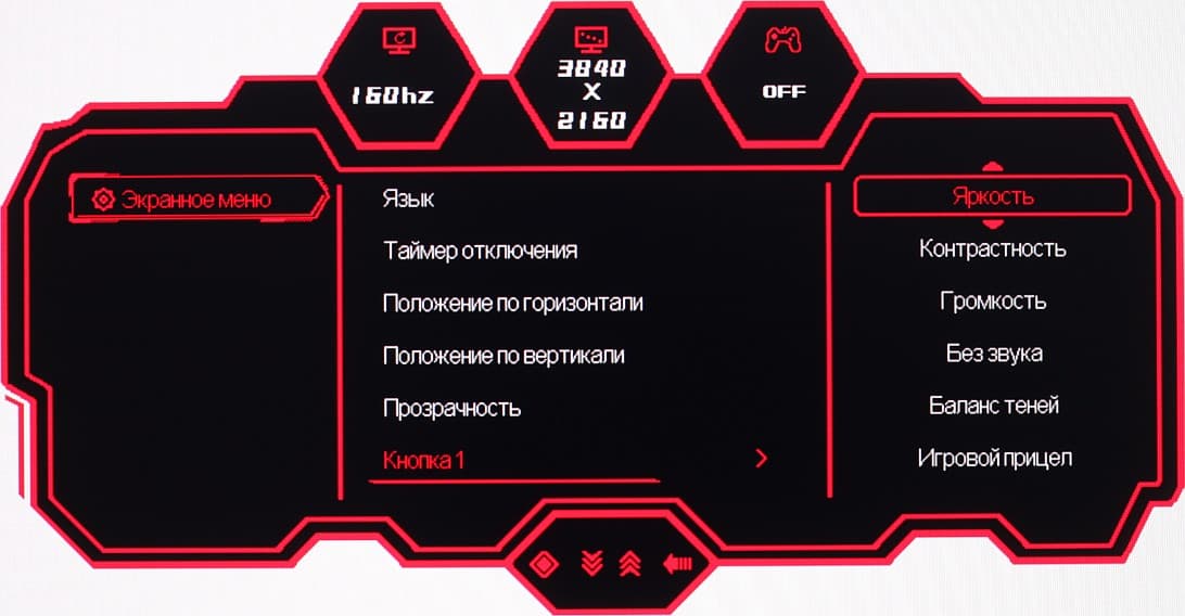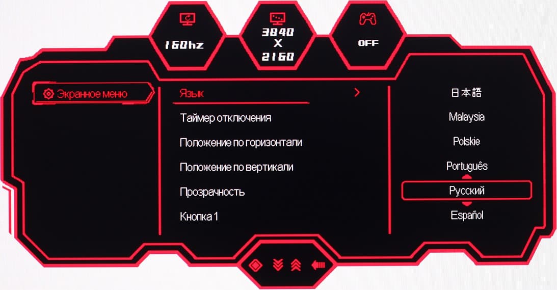 Настраиваются положение меню на экране, уровень прозрачности фона и задержка автоматического выхода из меню. Можно включить блокировку меню. Присутствует русская версия экранного меню.