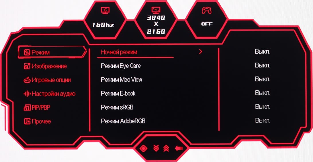 Есть тринадцать редактируемых профиля с сочетаниями настроек, в том числе три игровых. В некоторых профилях ряд настроек недоступны для изменений.