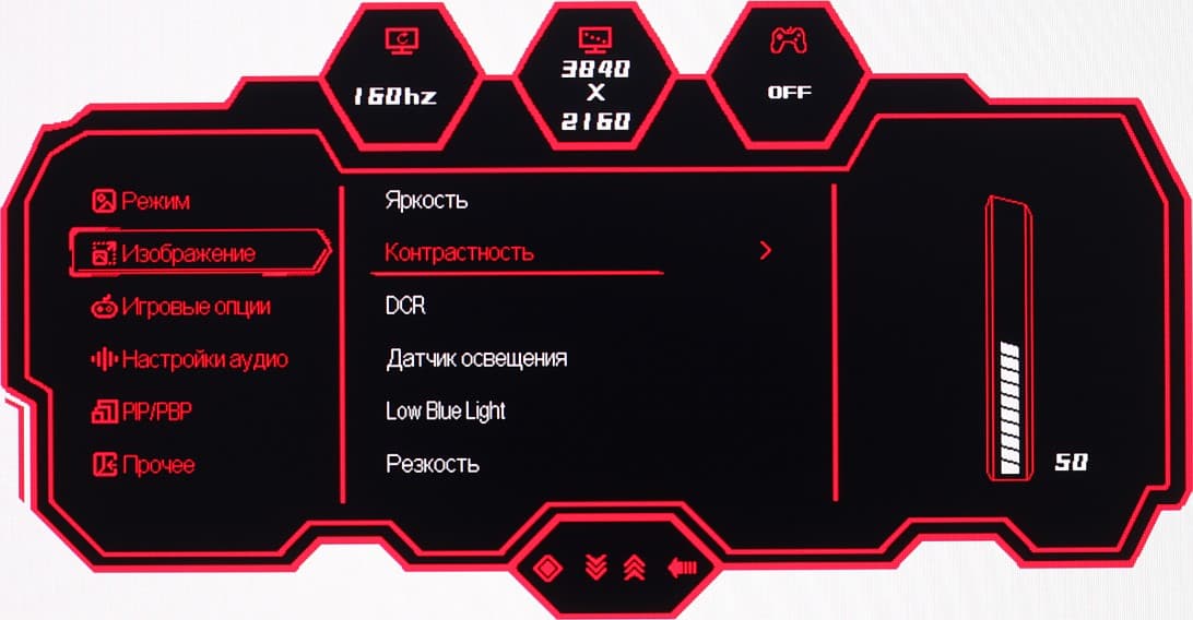 Навигация неудобная, так как нужно переносить палец с кнопки на кнопку. При настройке изображения меню остается на экране — это несколько мешает оценке вносимых изменений.