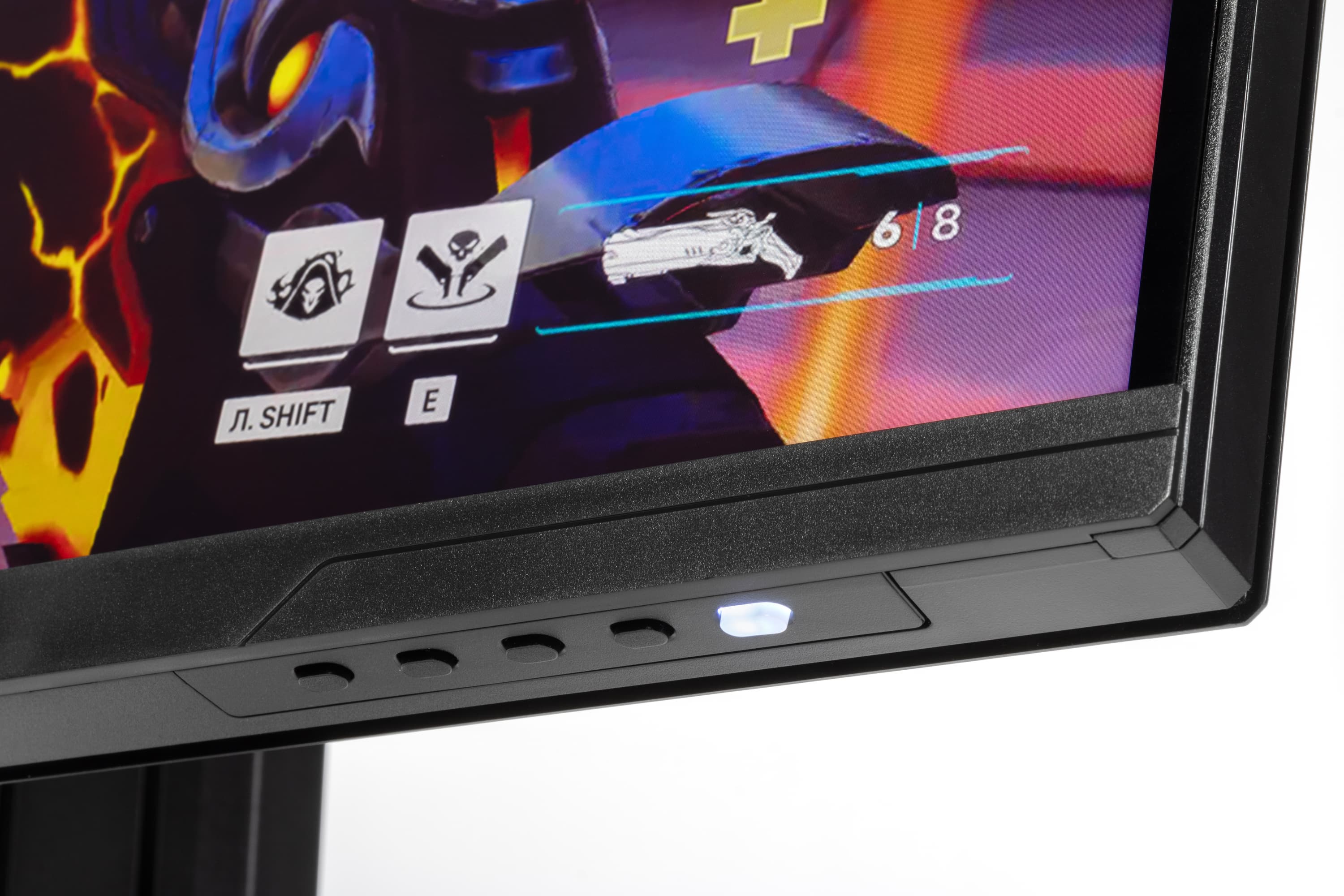 Индикатор питания при работе неярко светится белым, в режиме ожидания — красным и не горит, если монитор условно выключен. Если монитор работает, и на экране нет меню, то при нажатии на первую кнопку (если слева направо) выводится меню установок, а на вторую, третью и четвертую — список или ползунок настройки, выбранной в меню для данной кнопки.
