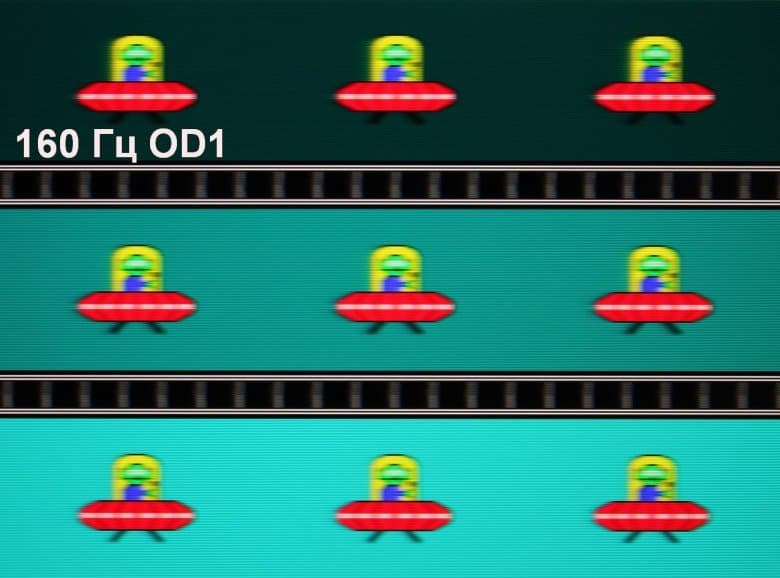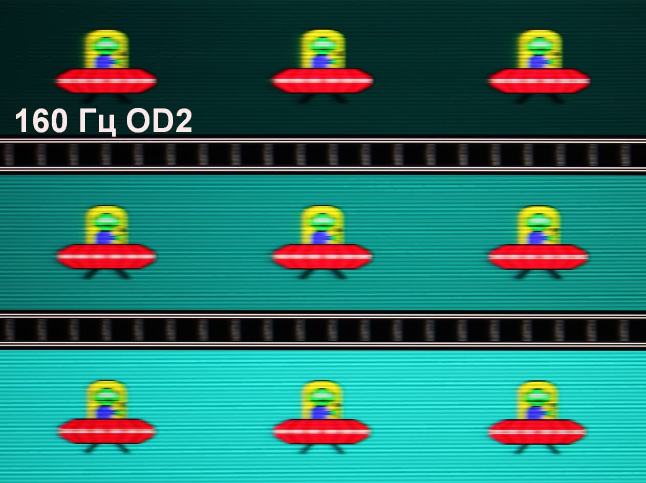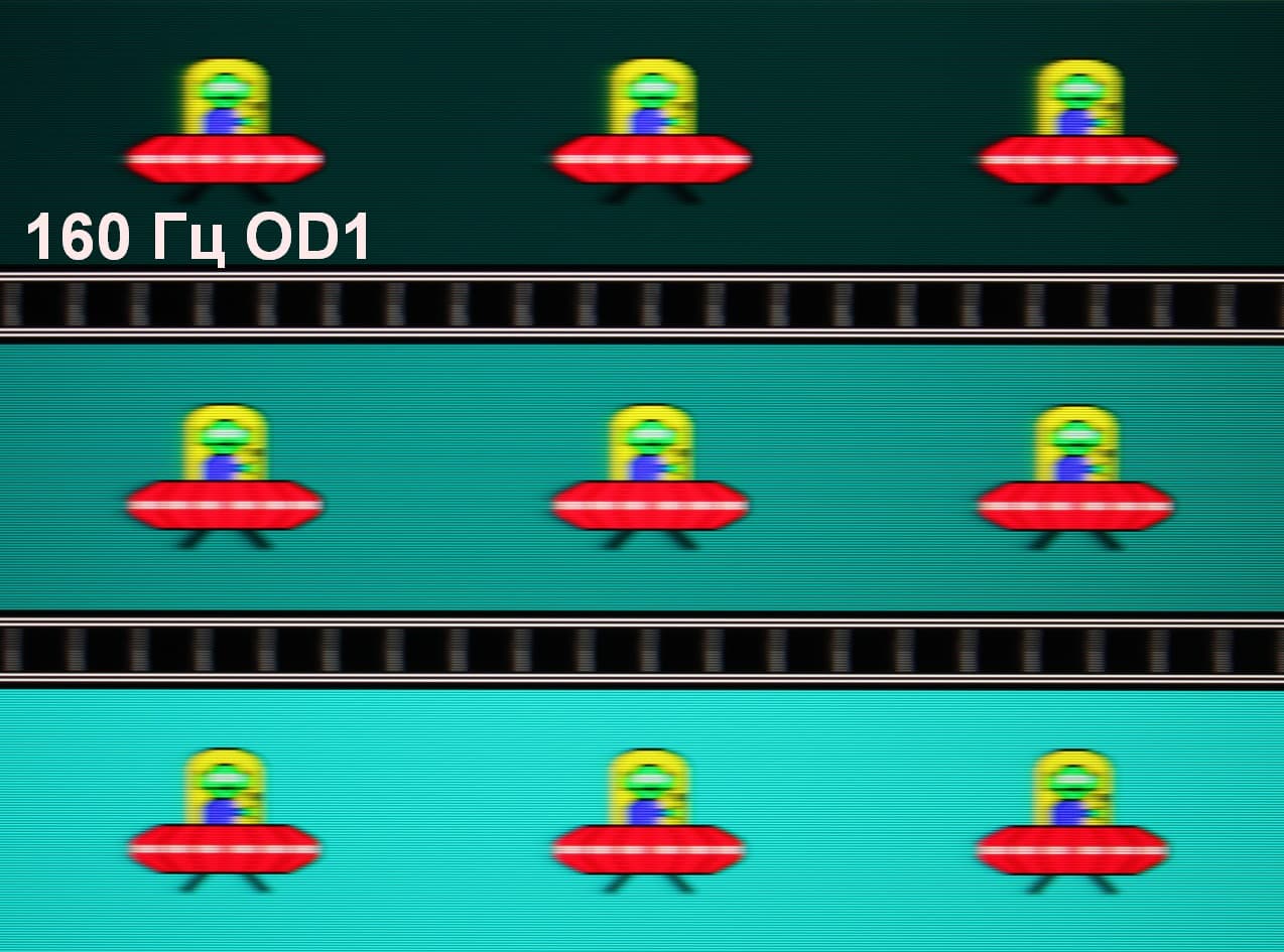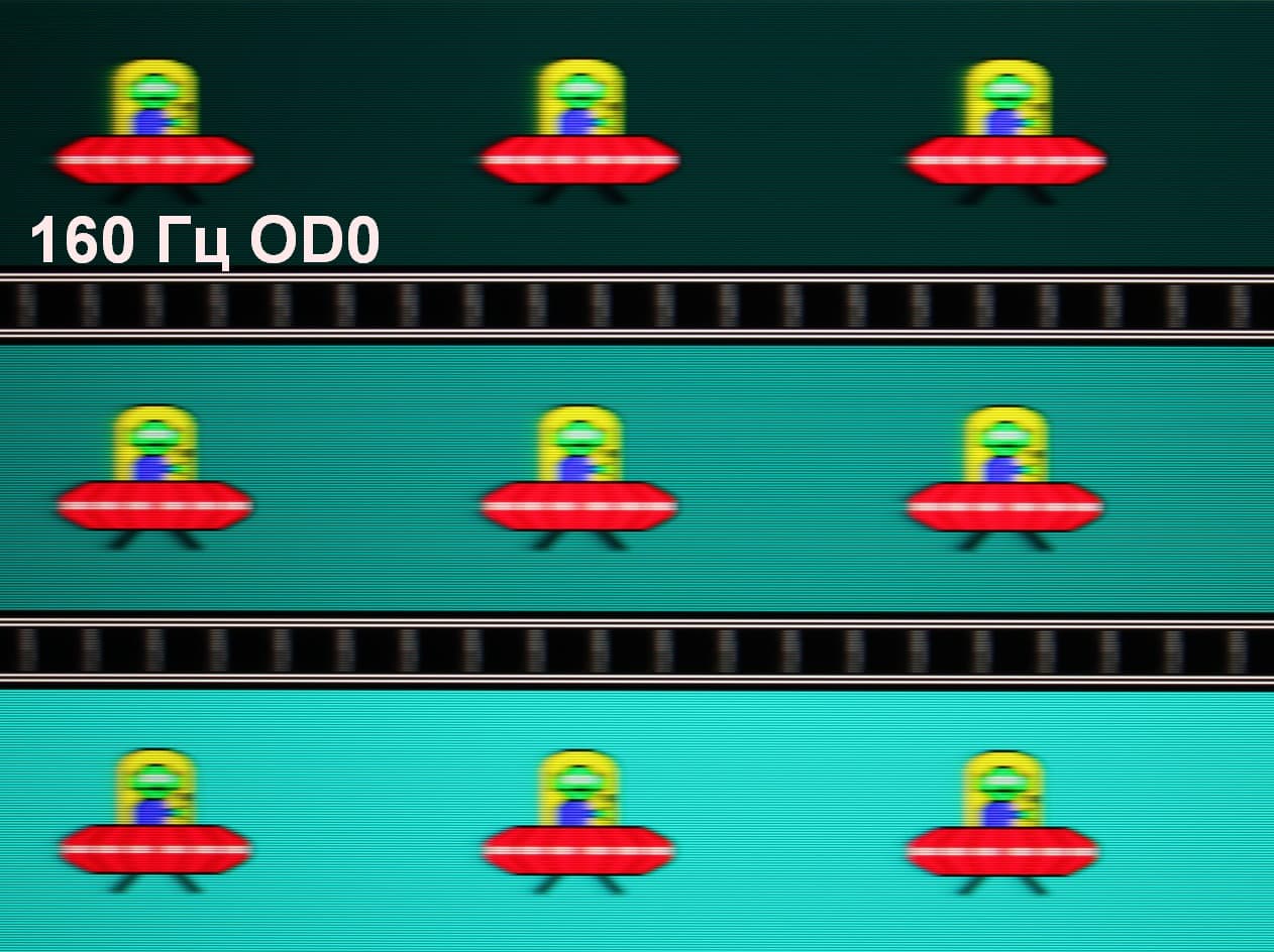 Для наглядного представления о том, что на практике означает такая скорость матрицы, и какие могут быть артефакты от разгона, приведем серию снимков, полученных с помощью движущейся камеры. Такие снимки показывают, что видит человек, если он следит глазами за двигающимся на экране объектом. Описание теста приведено тут, страница с самим тестом тут. Использовались рекомендованные установки (скорость движения 960 пиксель/с, выдержка 1/15 с). На фотографиях указаны значения частоты обновления, а также включен ли разгон (ODx; x = 0 — 4) и режим вставки темного кадра (MPRT).