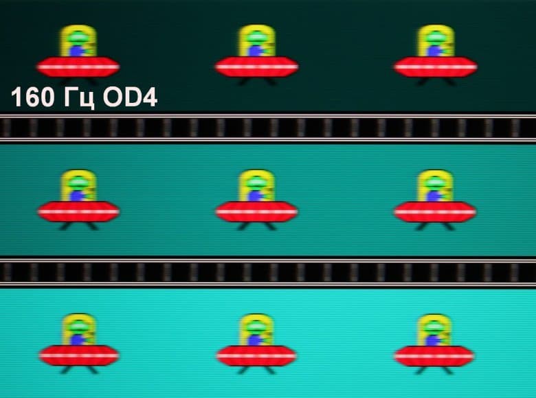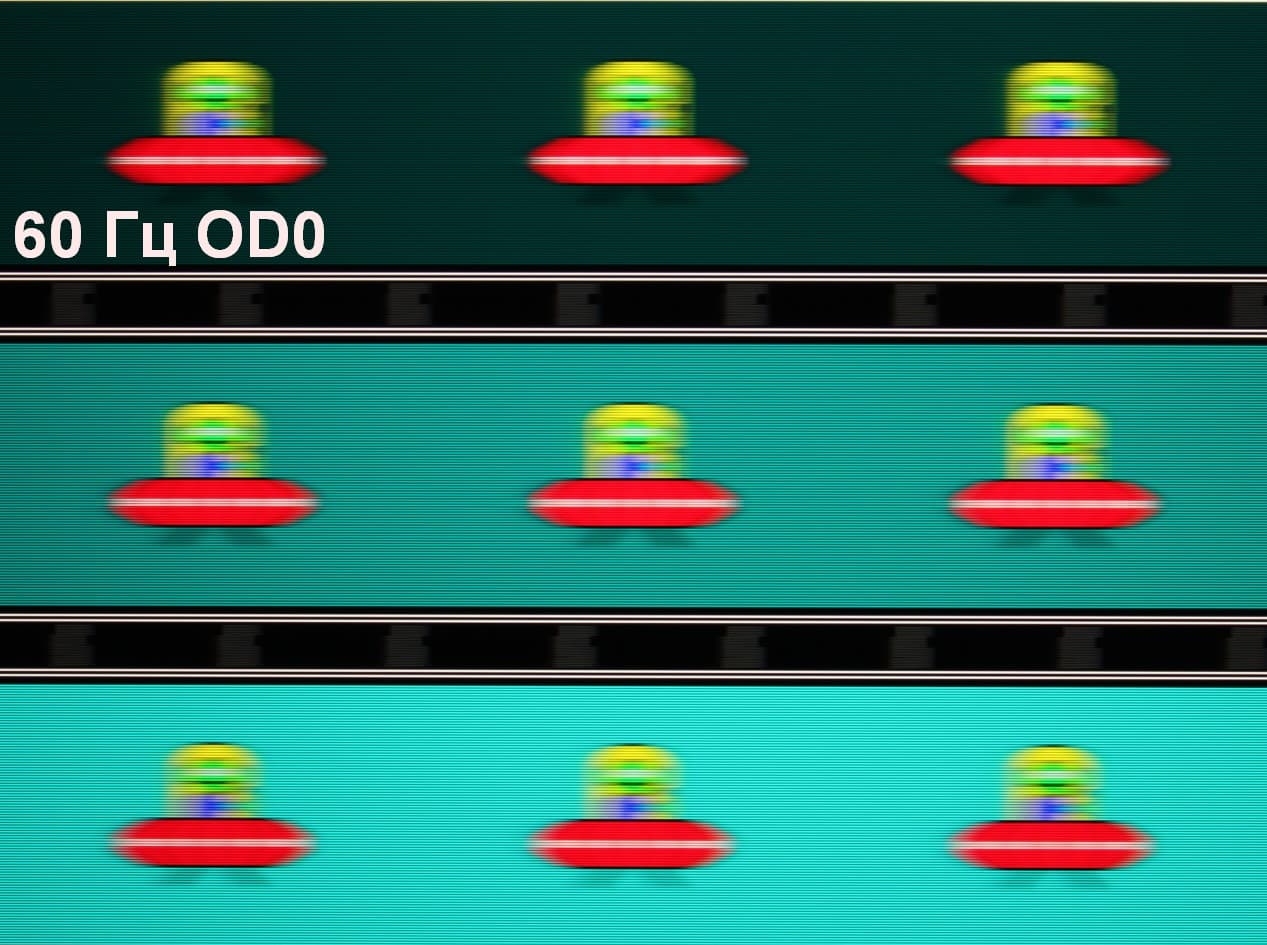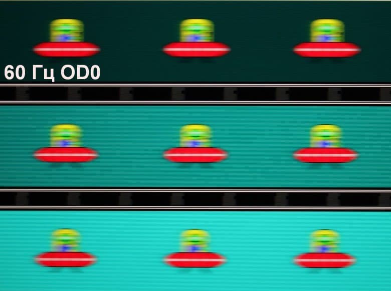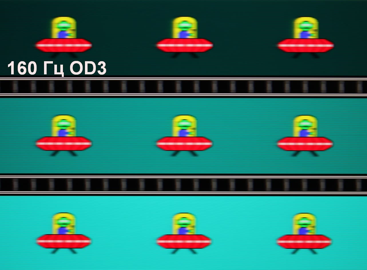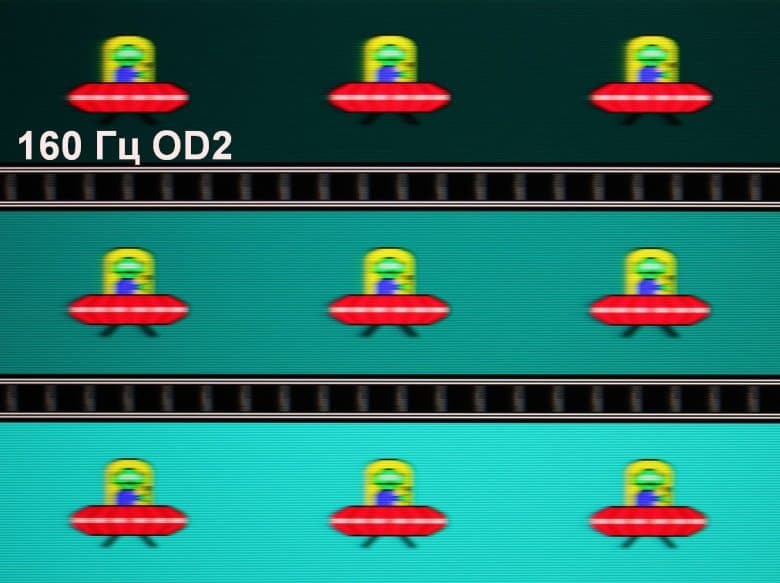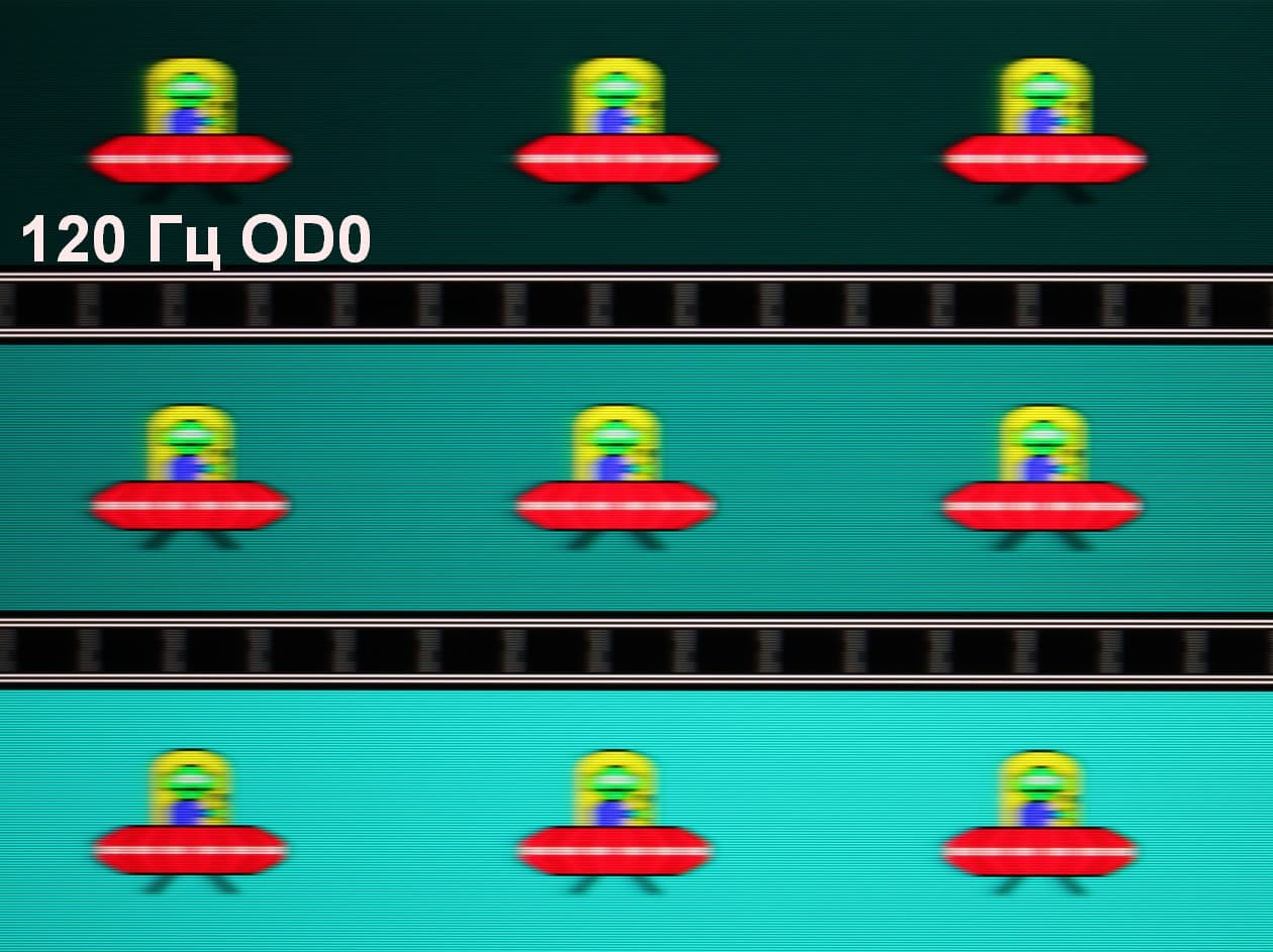 Для наглядного представления о том, что на практике означает такая скорость матрицы, и какие могут быть артефакты от разгона, приведем серию снимков, полученных с помощью движущейся камеры. Такие снимки показывают, что видит человек, если он следит глазами за двигающимся на экране объектом. Описание теста приведено тут, страница с самим тестом тут. Использовались рекомендованные установки (скорость движения 960 пиксель/с, выдержка 1/15 с). На фотографиях указаны значения частоты обновления, а также включен ли разгон (ODx; x = 0 — 4) и режим вставки темного кадра (MPRT).