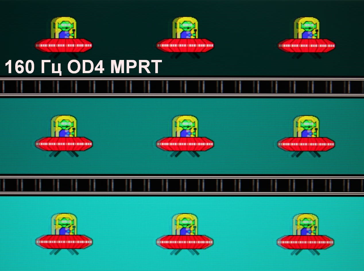 Видно, что при прочих равных условиях четкость изображения повышается по мере роста частоты обновления и степени разгона, и даже на максимальном разгоне артефакты мало заметны. Включение MPRT увеличивает четкость вплоть до одного пикселя по горизонтали, но объекты в движении имеют остаточные копии, что снижает положительный эффект.
