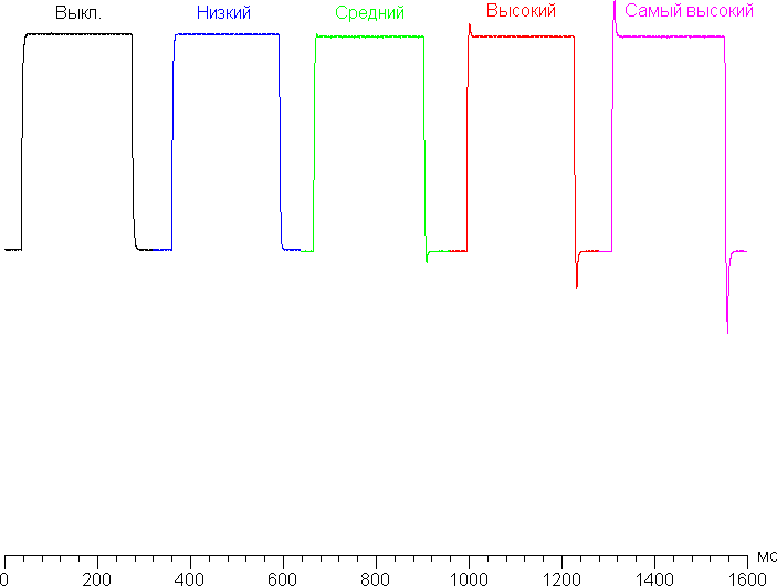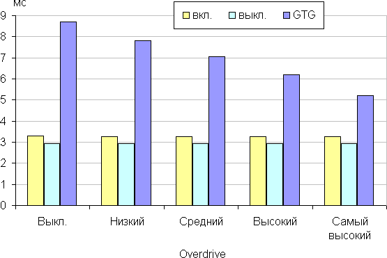 Время отклика зависит от значения настройки Overdrive (пять значений), которая управляет разгоном матрицы. График ниже показывает, как меняется время включения и выключения при переходе черный-белый-черный (столбики «вкл.» и «выкл.»), а также среднее суммарное время для переходов между полутонами (столбики GTG):
