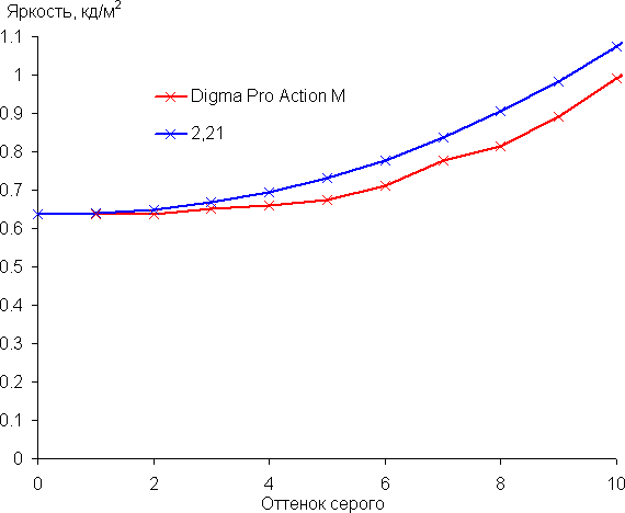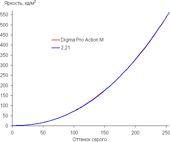 Аппроксимация полученной гамма-кривой дала показатель 2,21, что очень близко к стандартному значению 2,2, при этом реальная гамма-кривая мало отклоняется от аппроксимирующей степенной функции: