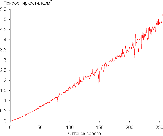 Мы измерили яркость 256 оттенков серого (от 0, 0, 0 до 255, 255, 255) при настройке Гамма = 2.2 (так по умолчанию). График ниже показывает прирост (не абсолютное значение!) яркости между соседними полутонами: