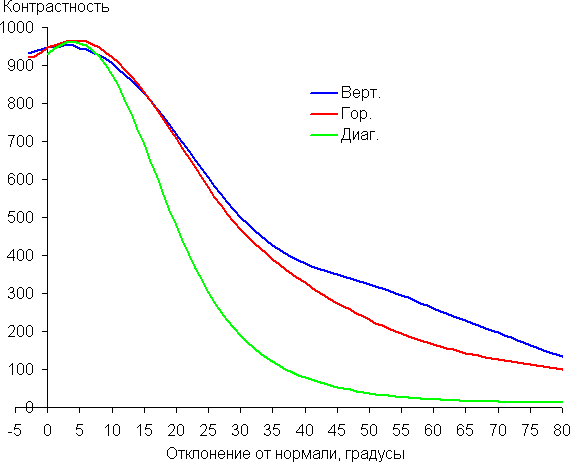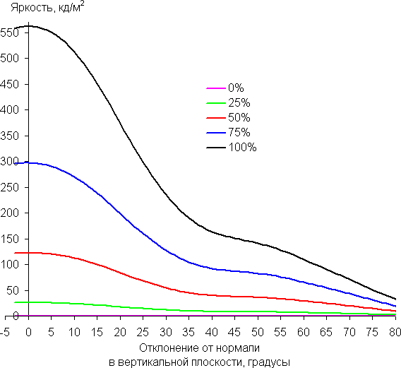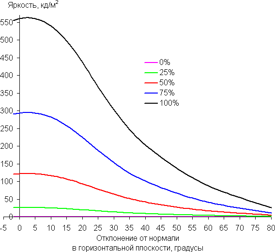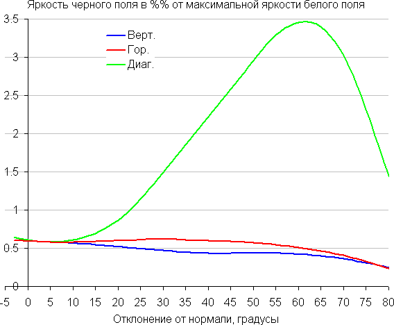 Углы обзора по снижению яркости не очень широкие. При отклонении в диагональном направлении яркость черного поля начинает резко возрастать уже при 20°-30° отклонения от перпендикуляра к экрану, и возрастает максимум до примерно 3,5% от максимальной яркости белого поля. Даже для матрицы типа IPS это очень высокое. Если сидеть не очень далеко от экрана, то черное поле по углам будет заметно светлее, чем в центре (оставаясь примерно нейтрально-серым по оттенку). Контрастность в диапазоне углов ±82° приближается к отметке 10:1 только при отклонении по диагонали, но все равно остается выше этого значения.
