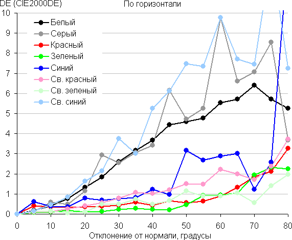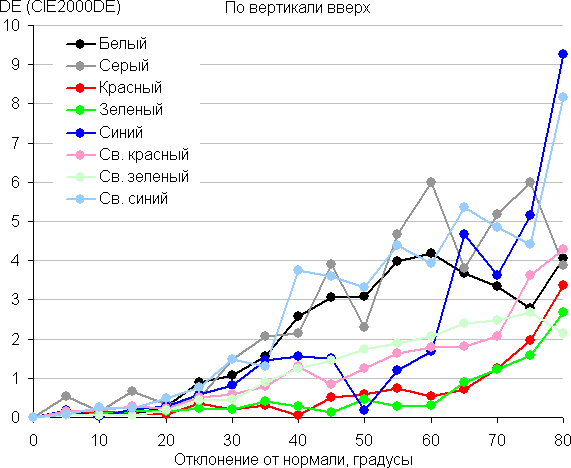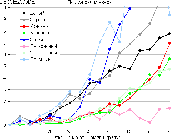 Для количественной характеристики изменения цветопередачи мы провели колориметрические измерения для белого, серого (127, 127, 127), красного, зеленого и синего, а также светло-красного, светло-зеленого и светло-синего полей во весь экран с использованием установки, подобной той, что применялась в предыдущем тесте. Измерения проводились в диапазоне углов от 0° (датчик направлен перпендикулярно к экрану) до 80° с шагом в 5°. Полученные значения интенсивностей были пересчитаны в ΔE относительно замера каждого поля при перпендикулярном положении датчика относительно экрана. Результаты представлены ниже: