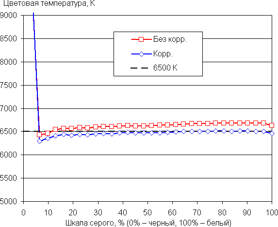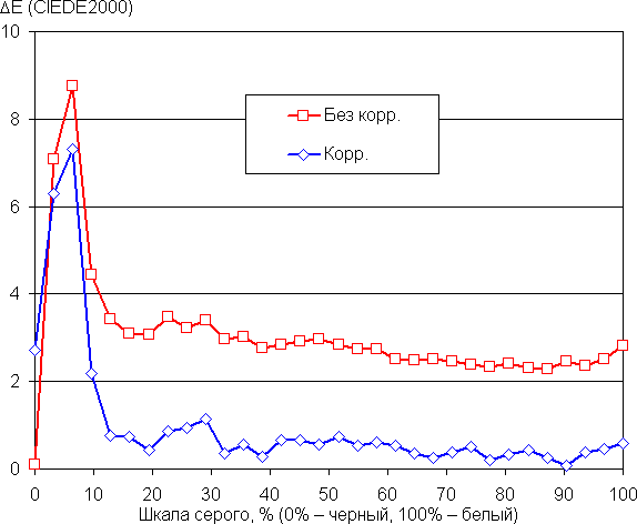 Самый близкий к черному диапазон можно не учитывать, так как в нем цветопередача не так важна, а погрешность измерения цветовых характеристик высокая. Цветовой баланс во всех двух случаях хороший, так как цветовая температура достаточно близка к стандартным 6500 К и отклонение от спектра абсолютно черного тела (ΔE) ниже 10 единиц, что для потребительского устройства считается приемлемым показателем. При этом оба параметра мало изменяются на различных участках шкалы серого, что улучшает визуальное восприятие цветового баланса. Тем не менее простой корректировкой цветовой баланс удается улучшить до уровня профессиональных моделей.