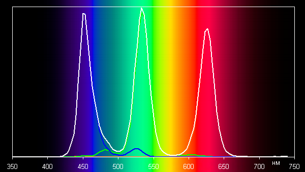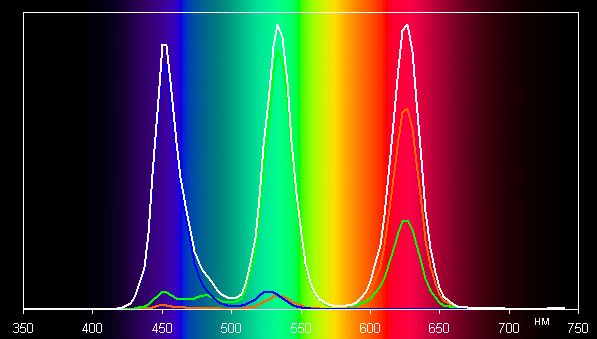 Ниже приведен спектр для белого поля (белая линия), наложенный на спектры красного, зеленого и синего полей (линии соответствующих цветов) в случае исходного цветового охвата: