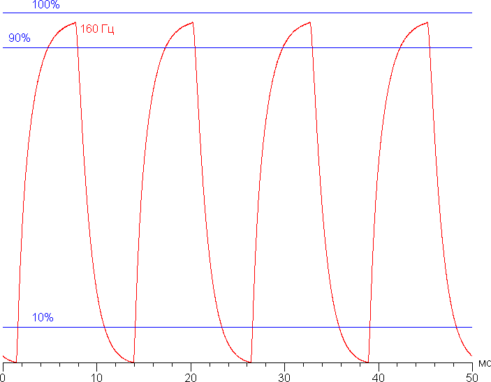 Видно, что при 160 Гц чередования максимальная яркость белого кадра гораздо выше уровня 90% белого, а минимальная яркость черного кадра равна черному в статике. Амплитуда изменения яркости значительно выше 80% от уровня белого. То есть согласно этому формальному критерию скорости матрицы достаточно для вывода изображения с кадровой частотой 160 Гц.