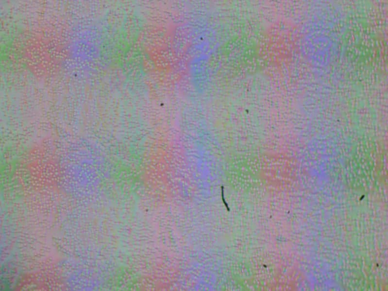 Зерно этих дефектов в несколько раз меньше размеров субпикселей (масштаб этих двух фотографий одинаковый), поэтому фокусировка на микродефектах и «перескок» фокуса по субпикселям при изменении угла зрения выражены слабо, из-за этого нет и «кристаллического» эффекта.