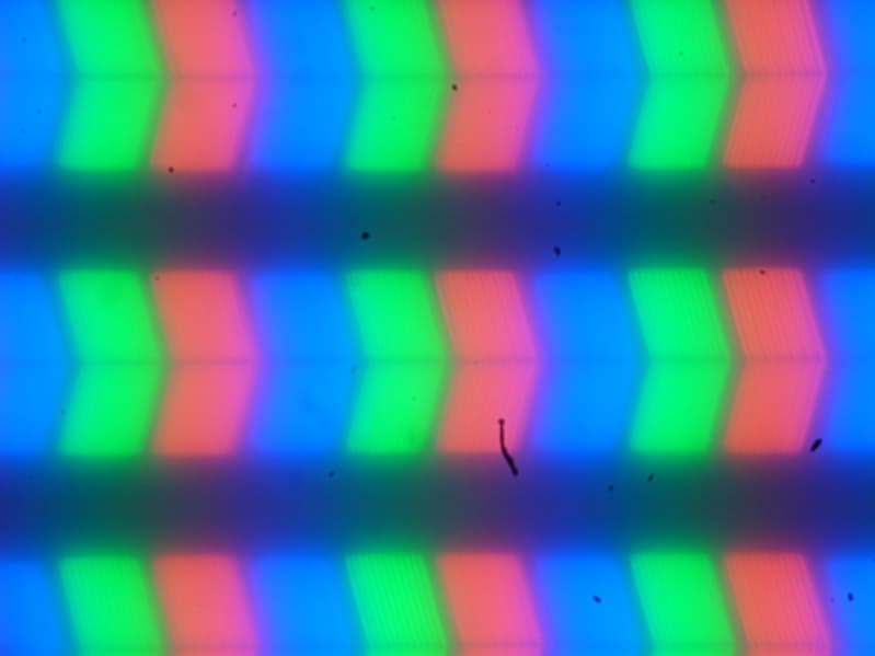 На микрофотографии ниже можно разглядеть типичную для IPS структуру в виде параллельных полосок, а также, что каждый субпиксель делится на два примерно равных домена (черные точки — это пыль на матрице фотоаппарата):