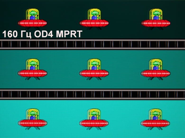 Есть режим со вставкой темного кадра с названием MPRT. Зависимости яркости (вертикальная ось) от времени (горизонтальная ось) когда эта функция включена приведена на правой половине рисунка выше. Четкость в движении действительно повышается, но на динамичной картинке появляются артефакты, о чем будет рассказано ниже, а из-за мерцания с частотой максимум в 160 Гц данный режим рекомендуется использовать с осторожностью, так как мерцание может приводить к повышенной утомляемости глаз.