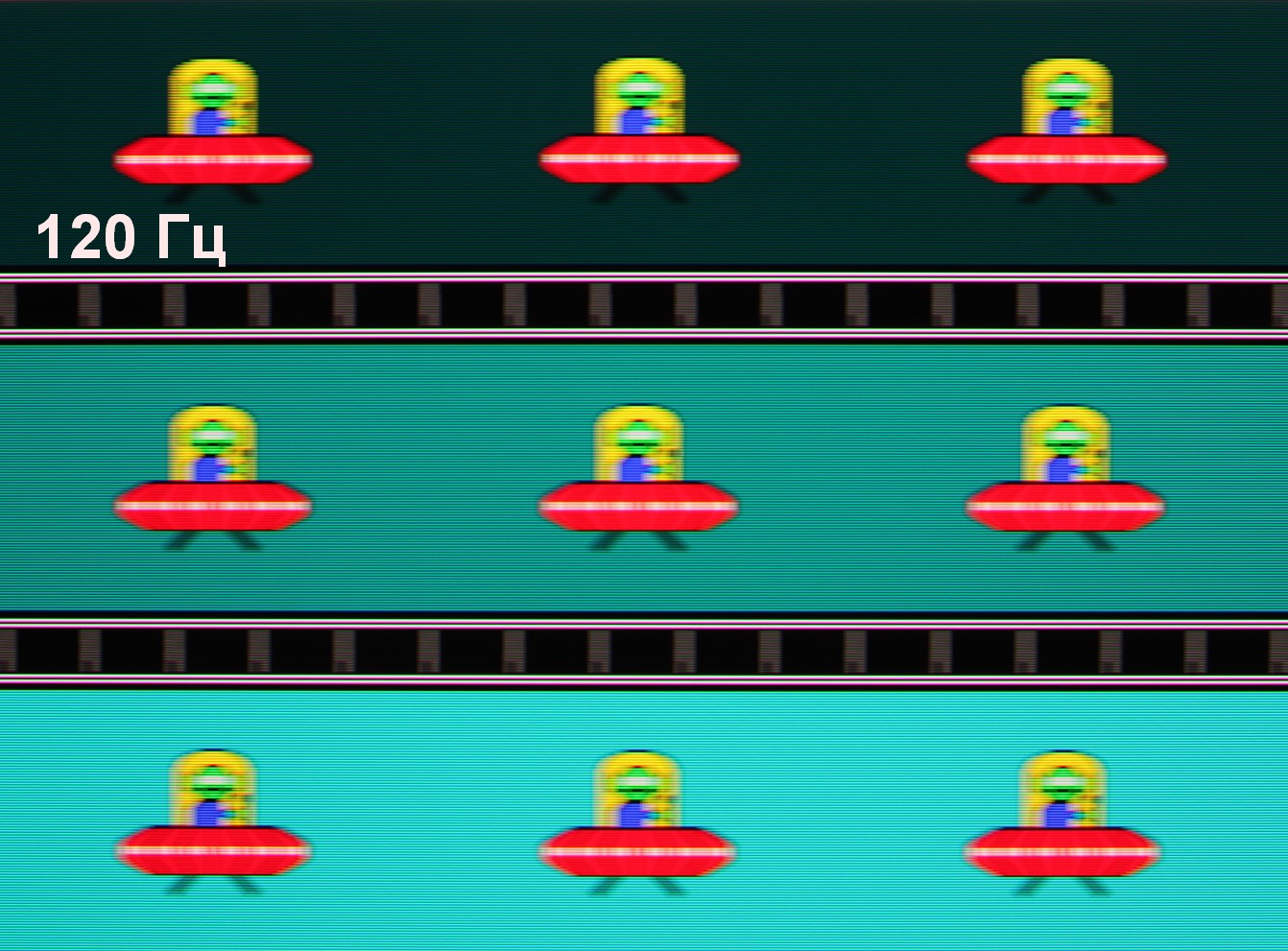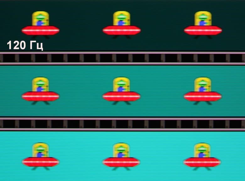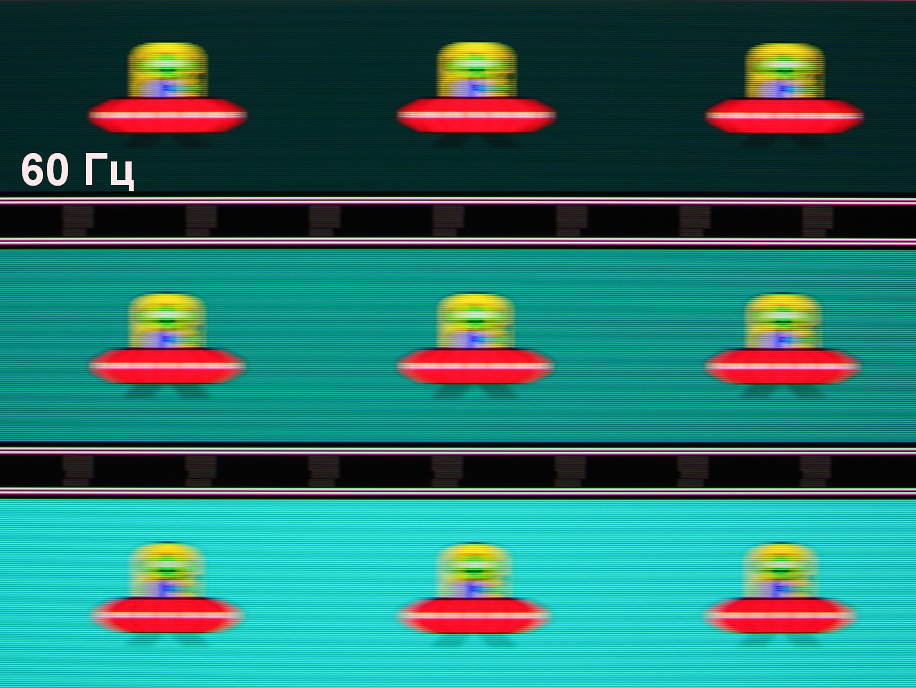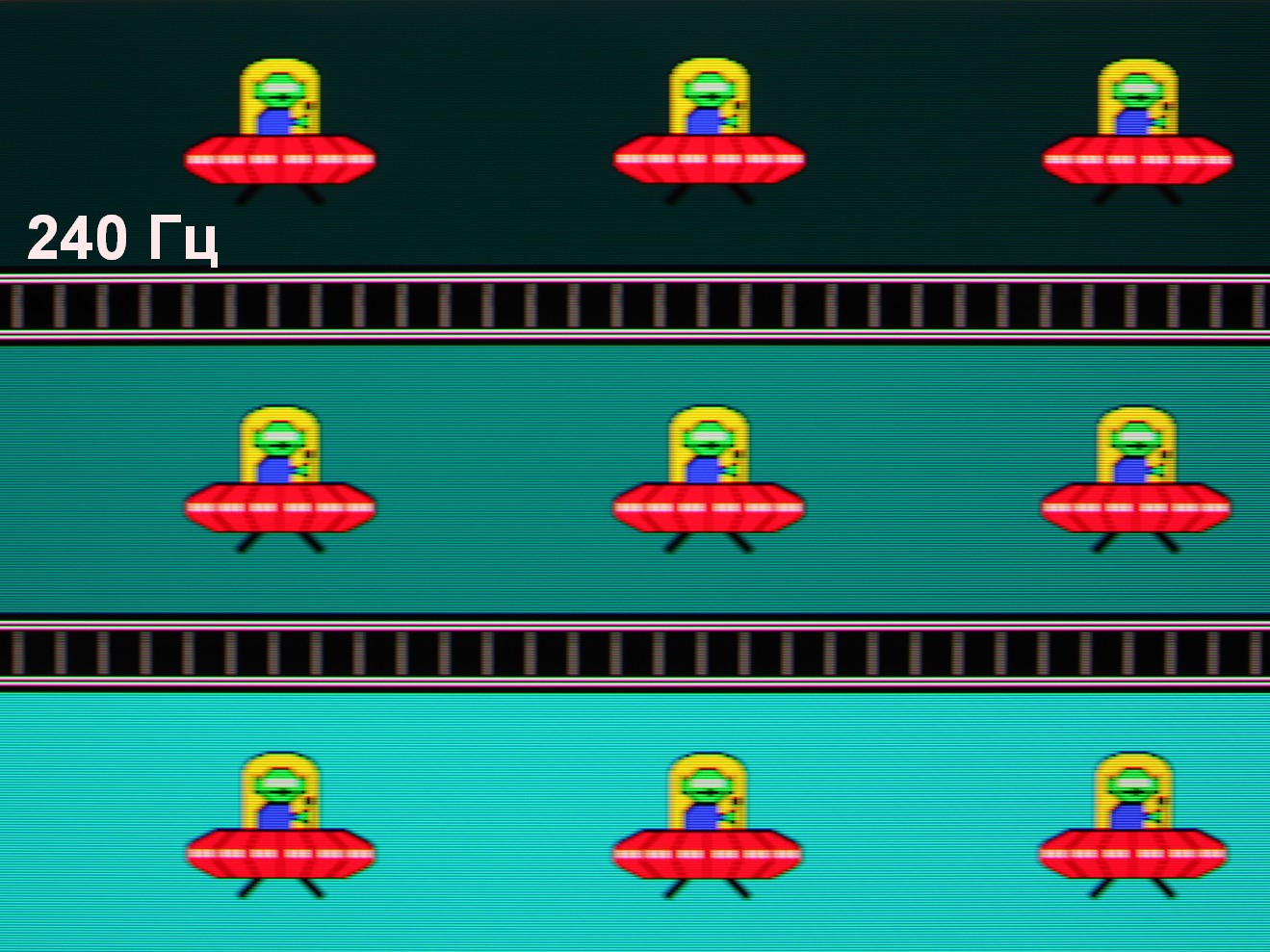 Для наглядного представления о том, что на практике означает такая скорость матрицы приведем серию снимков, полученных с помощью движущейся камеры. Такие снимки показывают, что видит человек, если он следит глазами за двигающимся на экране объектом. Описание теста приведено тут, страница с самим тестом тут. Использовались рекомендованные установки (скорость движения 960 пиксель/с для частот 60, 120 и 240 Гц), выдержка 1/15 с. На фотографиях указаны значения частоты обновления: