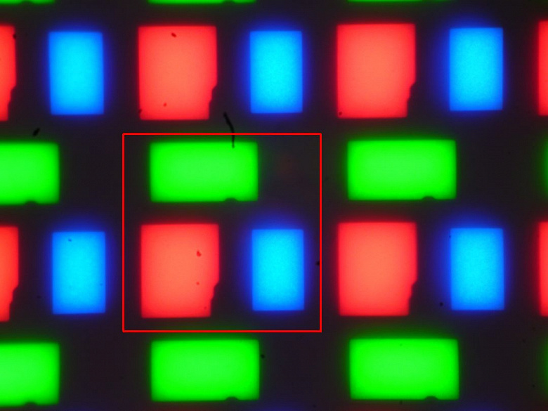 Так выглядят пиксели матрицы этого монитора при не очень большом увеличении в случае вывода белого цвета (красный квадрат очерчивает один пиксель):