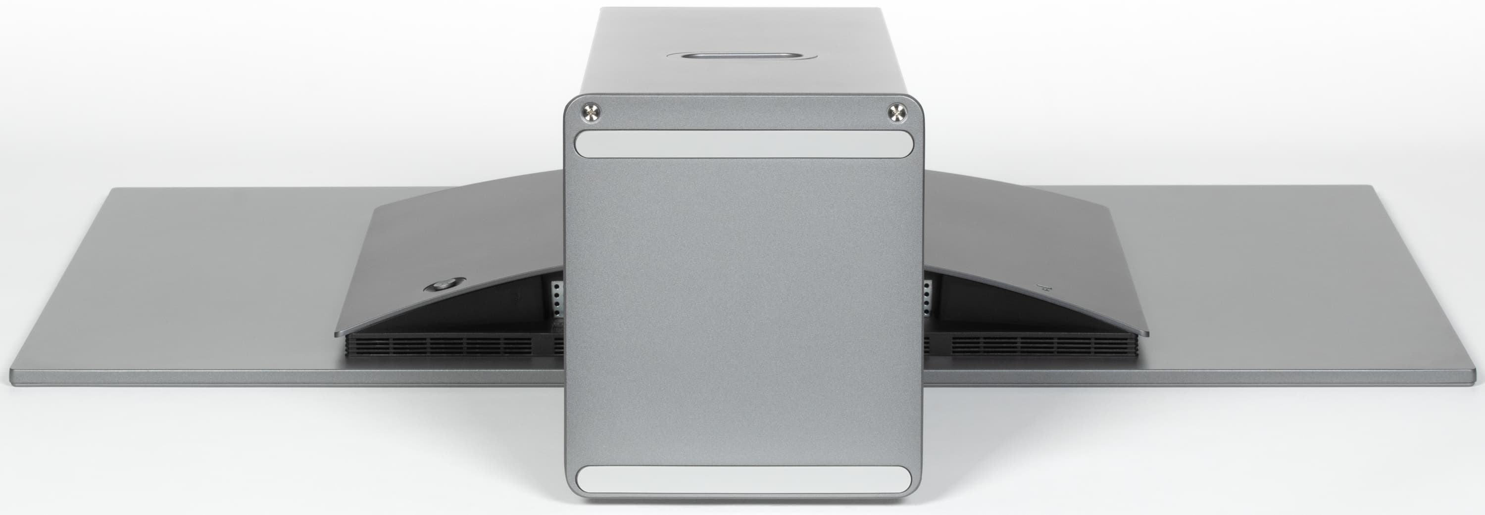 Плоская задняя панель матрицы изготовлена из тонкого листа стали. По периметру панель заходит на торцы матрицы и образует окантовку экрана. Выступающий назад кожух, закрывающий электронику, изготовлен из пластика. Толщина экрана, где его не прикрывает кожух, составляет всего 8 мм.