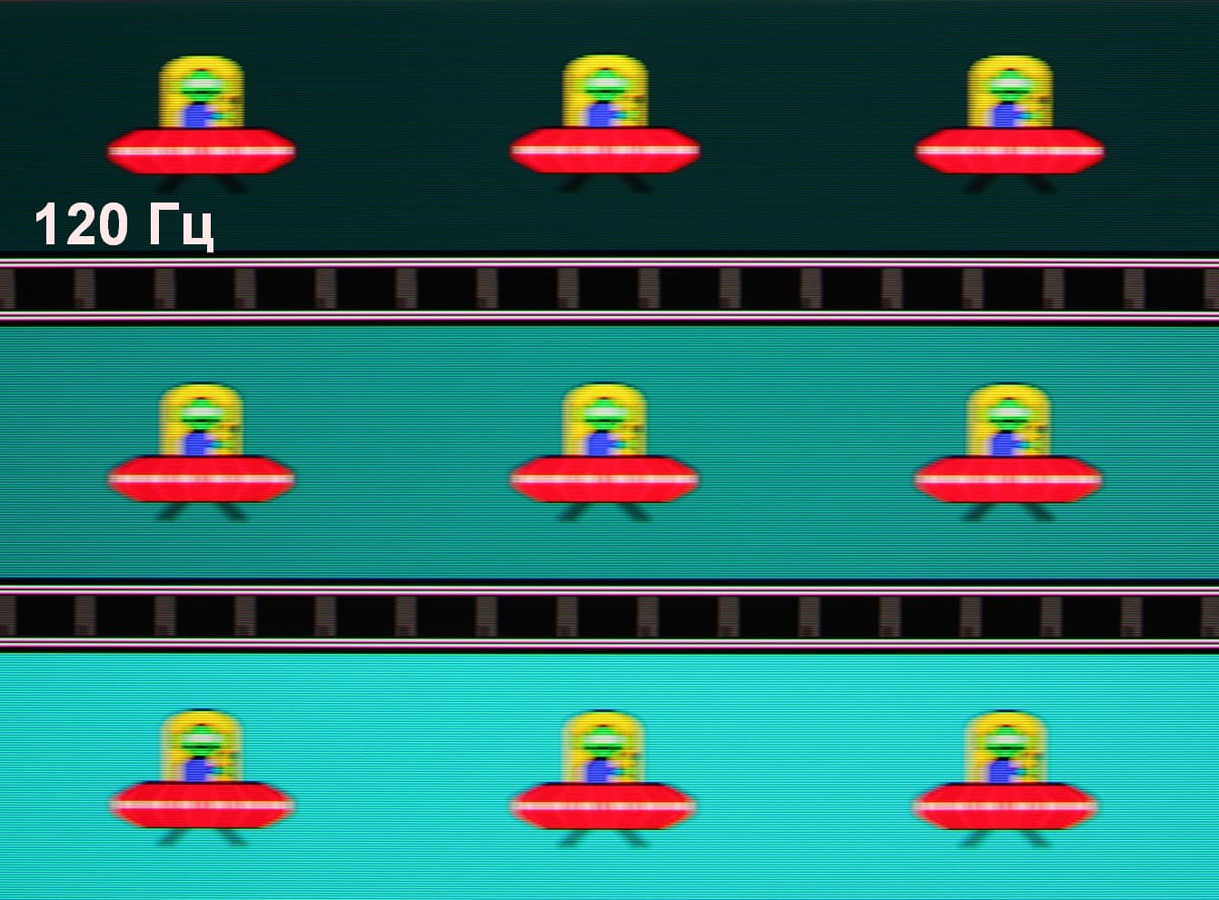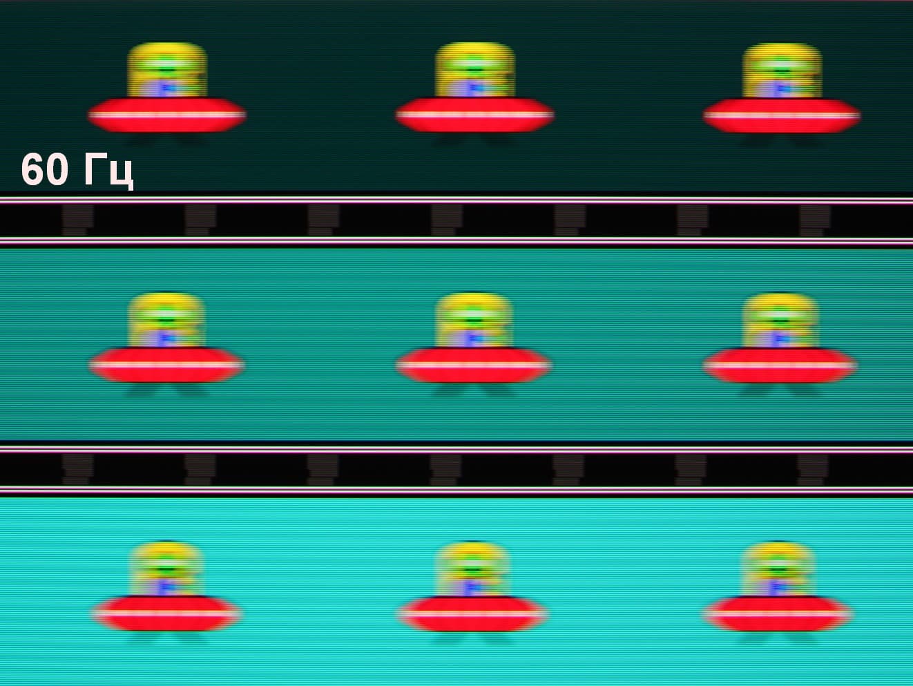 Попробуем представить, что было бы в случае матрицы с мгновенным переключением пикселей. Для нее при 60 Гц объект со скоростью движения 960 пиксель/с размывается на 16 пикселей, при 120 Гц — на 8 пикселей, при 240 Гц — на 4 пикселя. Размывается, так как фокус зрения движется с указанной скоростью (960 пиксель/с), а объект неподвижно выводится на 1/60, 1/120 или 1/240 секунды. Для иллюстрации этого сымитируем размытие на 16, 8 и 4 пикселя: