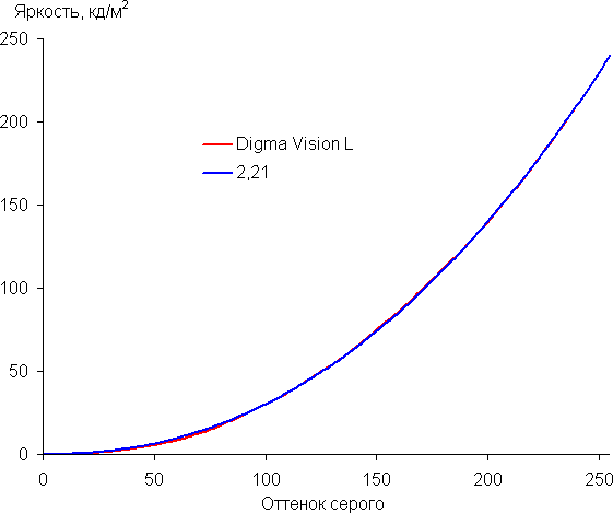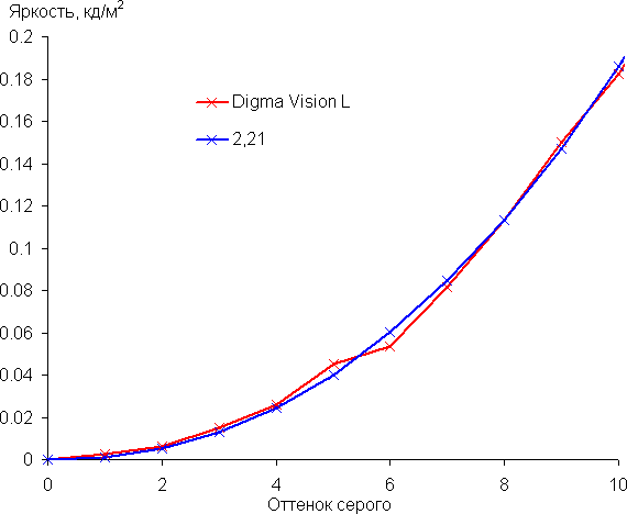 Аппроксимация полученной гамма-кривой дала показатель 2,21, что близко к стандартному значению 2,2. При этом аппроксимирующая степенная функция мало отклоняется от реальной гамма-кривой: