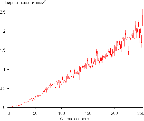 Для оценки характера роста яркости на шкале серого мы измерили яркость 256 оттенков серого (от 0, 0, 0 до 255, 255, 255). График ниже показывает скорость изменения (не абсолютное значение!) яркости между соседними полутонами: