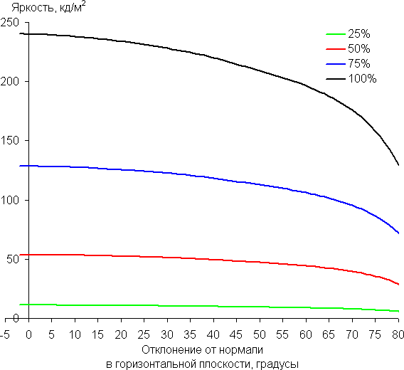 Снижение яркости на 50% от максимального значения достигается только при более чем 80 градусах отклонения. Для сравнения: в случае типичного ЖК-монитора на матрице VA яркость падает вдвое уже примерно при 35°.