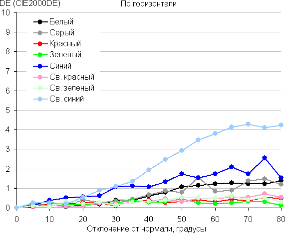 Для количественной характеристики изменения цветопередачи мы провели колориметрические измерения для белого, серого (127, 127, 127), красного, зеленого и синего, а также светло-красного, светло-зеленого и светло-синего полей во весь экран с использованием установки, подобной той, что применялась в предыдущем тесте. Измерения проводились в диапазоне углов от 0° (датчик направлен перпендикулярно к экрану) до 80° с шагом в 5°. Полученные значения интенсивностей были пересчитаны в отклонение ΔE относительно замера каждого поля при перпендикулярном положении датчика относительно экрана. Результаты представлены ниже: