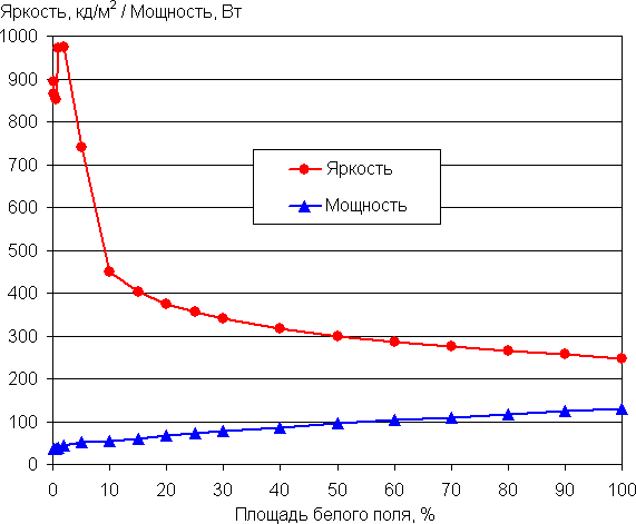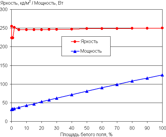 С изменением площади белого максимальная яркость также может меняться, при этом характер зависимости яркости от площади белого участка зависит как минимум от текущего режима — SDR или HDR. В случае HDR пользователь дополнительно может выбирать в настройках монитора между вариантами Авто, True Black 400 и Peak 1000 nit. Например, в случае сигнала SDR яркость от 2% до 100% площади белого сохраняется на уровне порядка 250 кд/м² (дополнительно по вертикальной оси отложена потребляемая мощность):