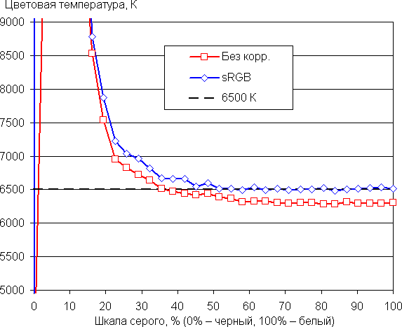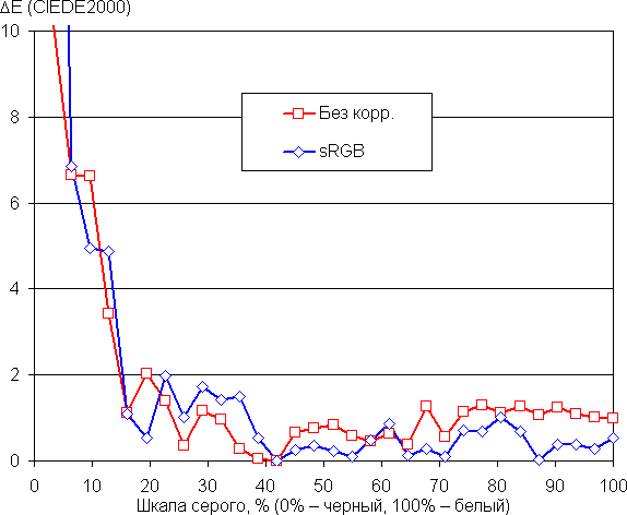 Графики ниже показывают цветовую температуру на различных участках шкалы серого и отклонение от спектра абсолютно черного тела (параметр ΔE) в случае настроек по умолчанию (подписано — Без корр.) и при выборе профиля sRGB (sRGB) также без дополнительной коррекции (которая, впрочем, и так невозможна):