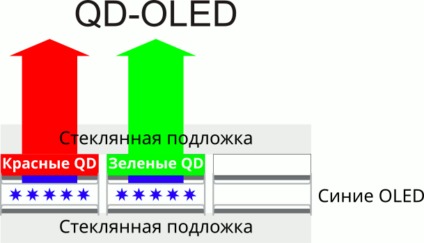 В данном экране используется матрица типа QD-OLED — активная матрица на органических светодиодах. Полноцветное изображение создается с помощью субпикселей трех цветов — красного (R), зеленого (G) и синего (B) в равном количестве — по три разного вида на пиксель. Каждый субпиксель имеет свой независимо управляемый OLED-источник синего света, а красный и зеленый цвета формируются с помощью светофильтров на квантовых точках (QD — Quantum Dots), размещенных перед этими источниками. Синий субпиксель светофильтра, разумеется, не имеет. Упрощенная схема ниже поясняет устройство QD-OLED: