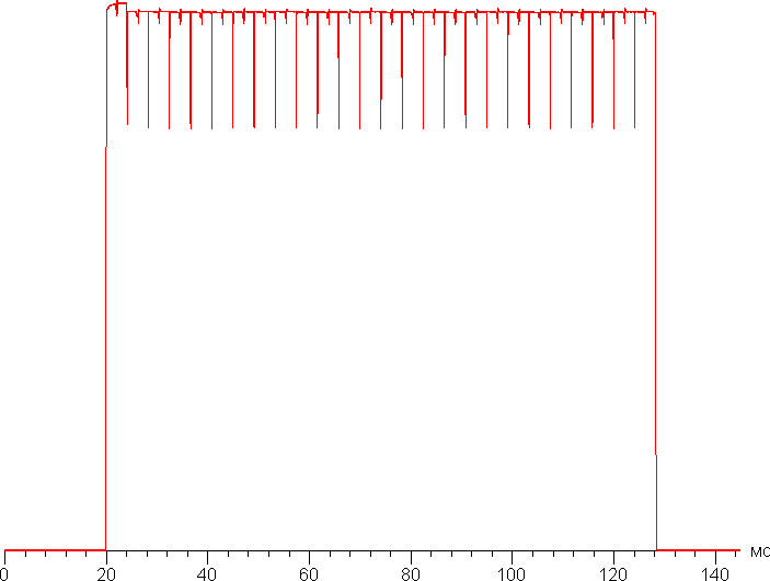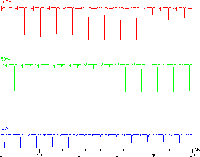 На любом уровне яркости видимое мерцание отсутствует, его не выявляет и тест на стробоскопический эффект. Регистрация зависимости яркости от времени при различных уровнях яркости выявила модуляцию яркости с очень высоким коэффициентом заполнения, что и объясняет отсутствие мерцания. В доказательство приведем графики зависимости яркости (вертикальная ось) от времени (горизонтальная ось) при различных значениях настройки Яркость в случае белого поля на 10% от площади экрана.