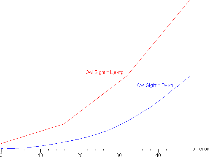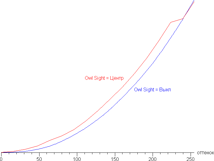Дополнительной настройкой Owl Sight можно скорректировать гамма-кривую, улучшая различимость деталей в тенях, в центральной области экрана или по всей его площади. Это может быть полезно в играх с темными сценами. Ниже приведены гамма-кривые для случаев, когда эта функция включена (по 32 точкам) и когда отключена: